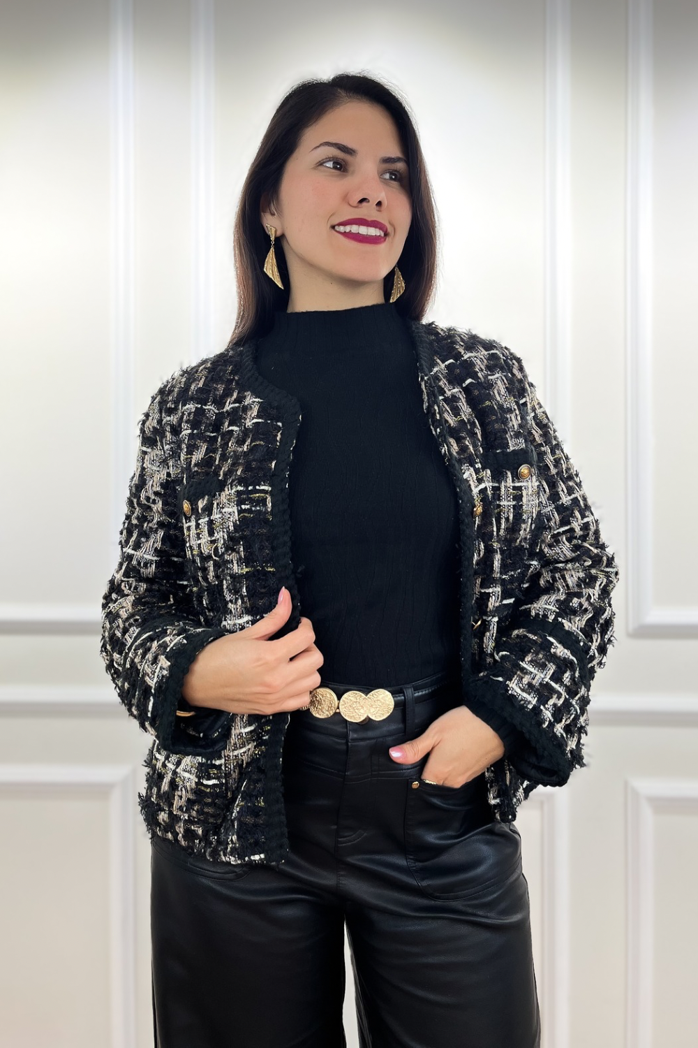 Chaqueta en tejido tweed, manga larga y escote redondo. Botones delanteros funcionales y bolsillos cuadrados en pecho y bajo. Forro interno efecto acolchado. Corte recto y fit regular.