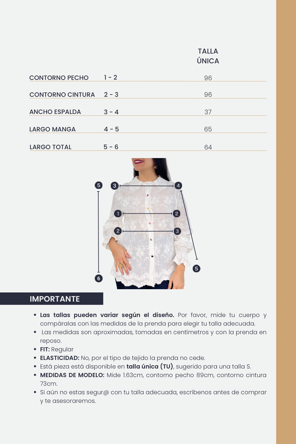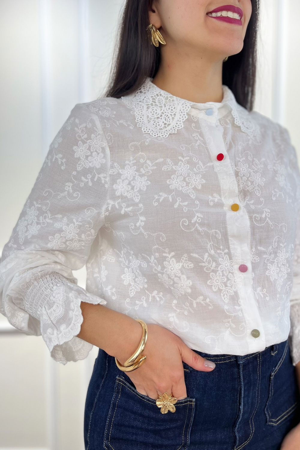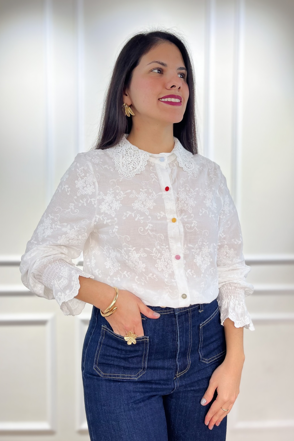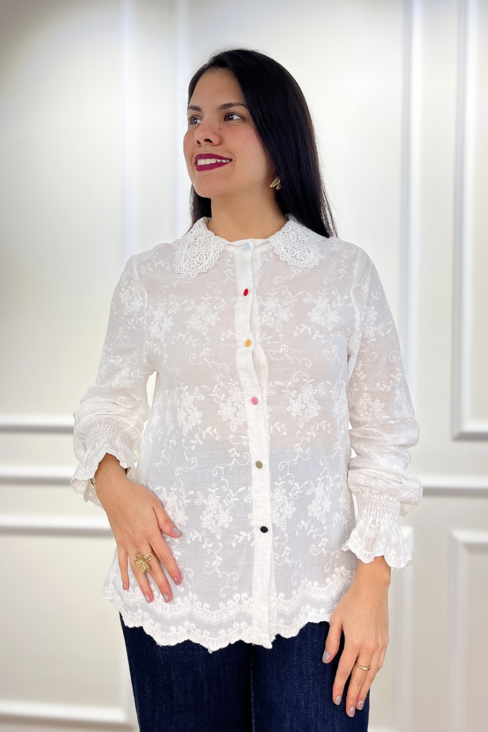 Camisa en tejido de algodón bordado, cuello con solapa de encaje, manga larga con efecto panal de abeja en puño y volados. Detalle de botones funcionales delanteros de colores, corte recto con bajo de scallops. Fit regular.