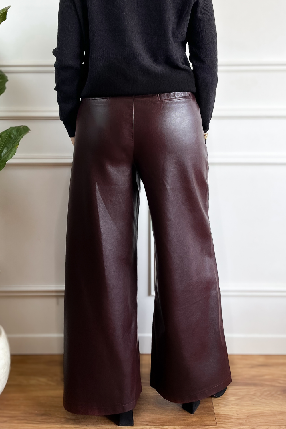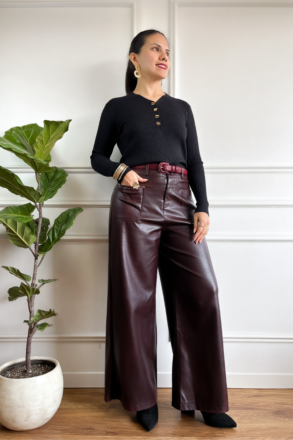 Pantalón estilo wide leg en tejido polipiel (cuerina). Tiro alto y cintura con trabillas. Pierna ancha con bota ligeramente acampanada. Cierre frontal con cremallera y botón. Bolsillos cuadrados en parte delantera y ribetes o falsos bolsillos por detrás. Efecto frisado interior que genera una mejor estructura, suavidad y abrigo.