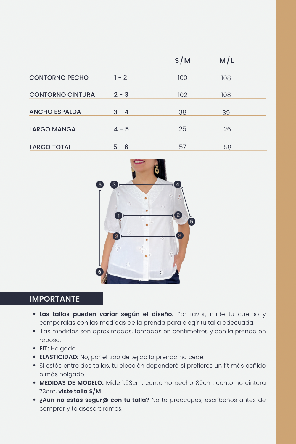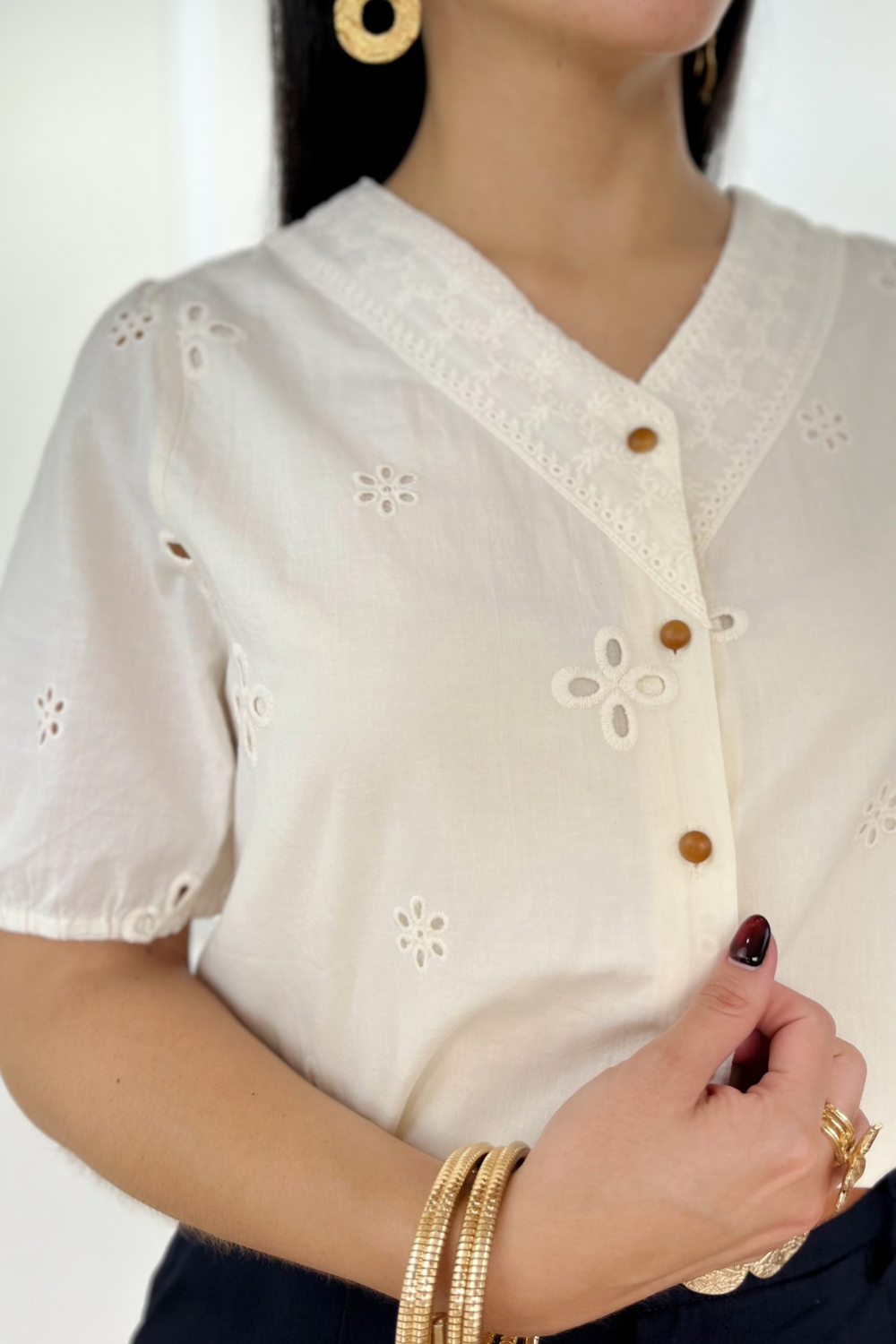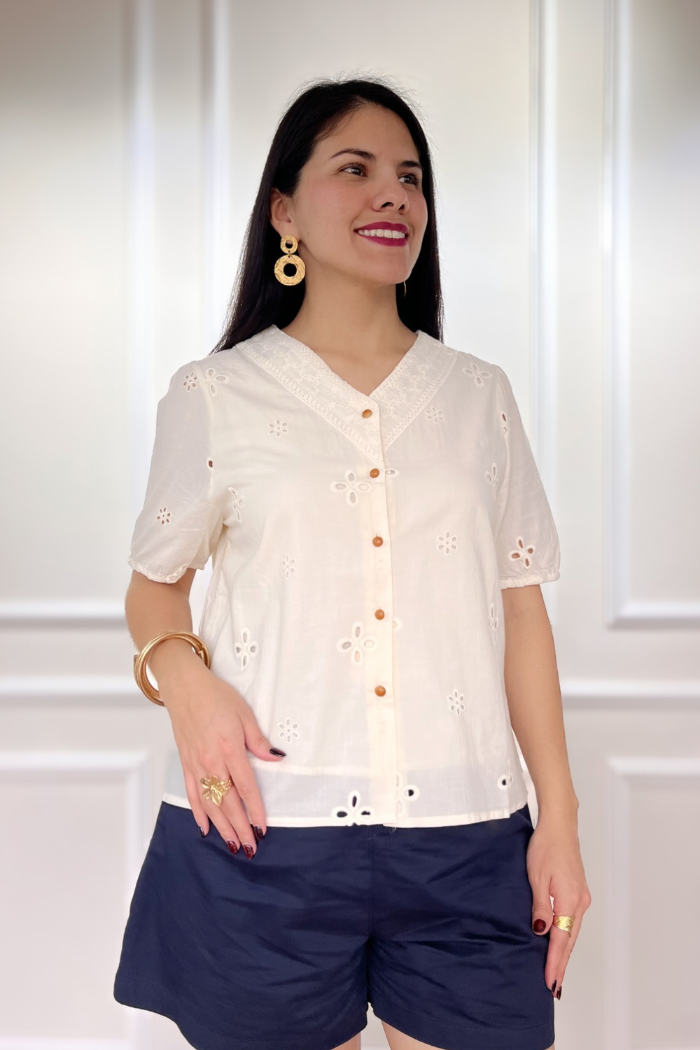 Blusa en tejido algodón, manga corta y escote V. Detalle de bordado en troquel de flores y botones funcionales delanteros en color chocolate. Corte recto en bajo y laterales. Fit holgado.