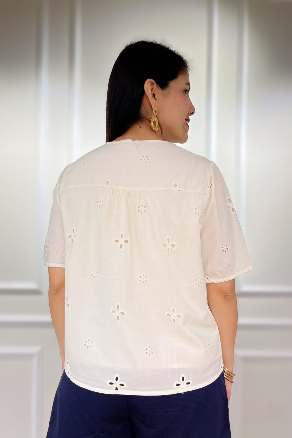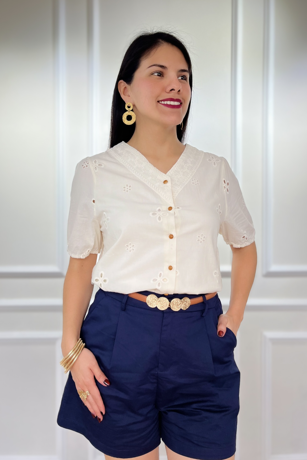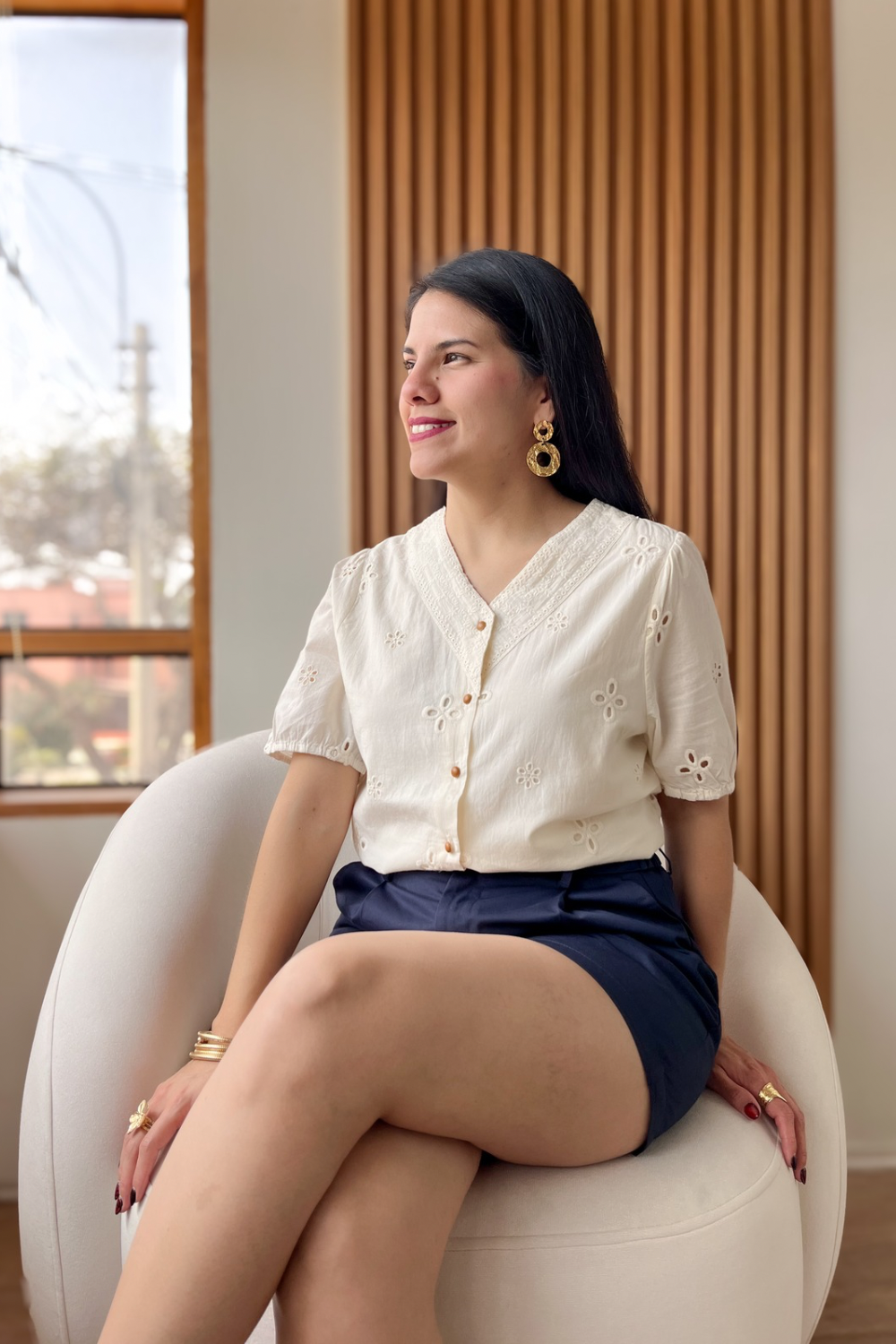 Blusa en tejido algodón, manga corta y escote V. Detalle de bordado en troquel de flores y botones funcionales delanteros en color chocolate. Corte recto en bajo y laterales. Fit holgado.