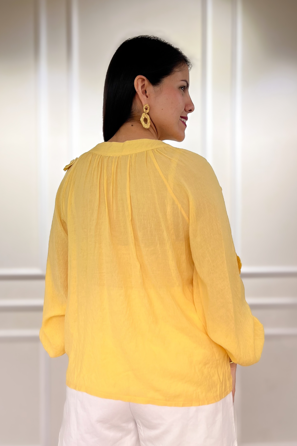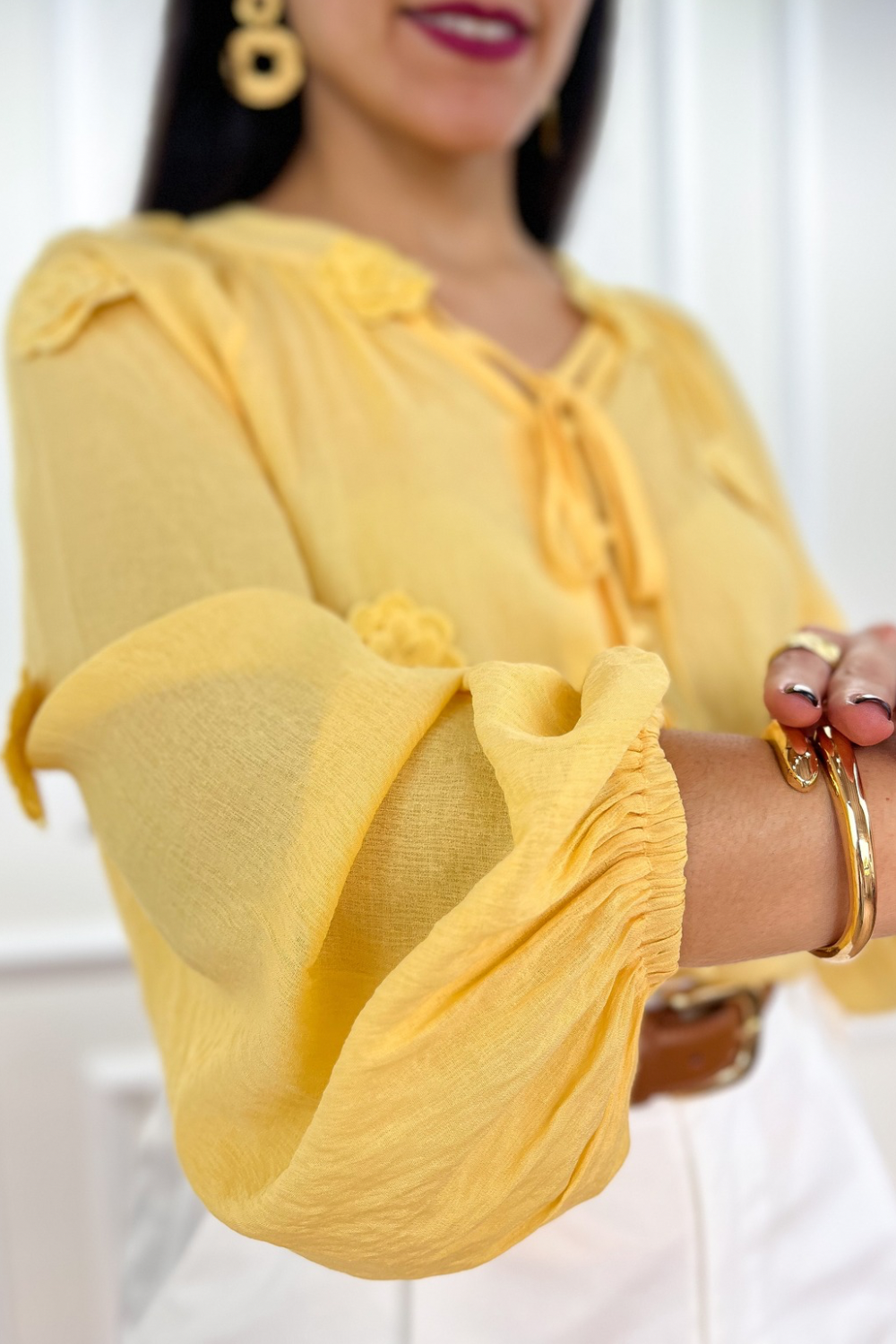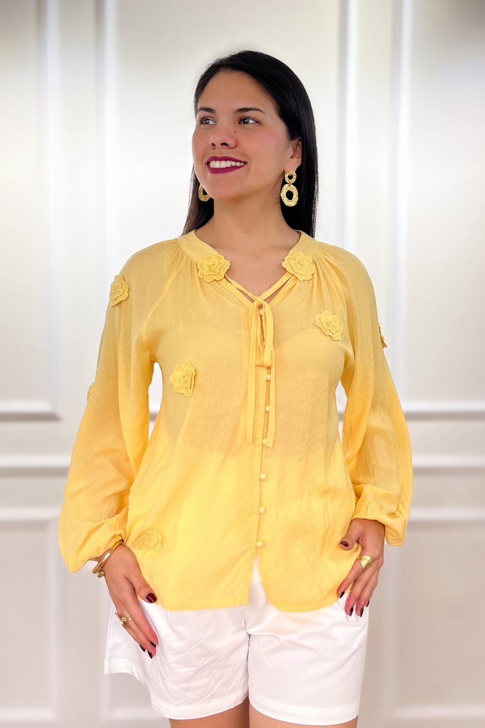 Blusa en tejido fluido beverly corrugado, escote V, hombros caídos y manga abullonada con elástico en puño. Detalle de flores tejidos en 3D y botones forrados delanteros funcionales. Corte recto. Fit holgado.