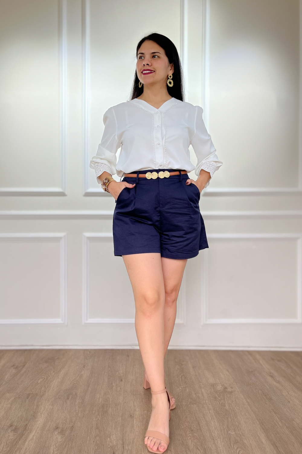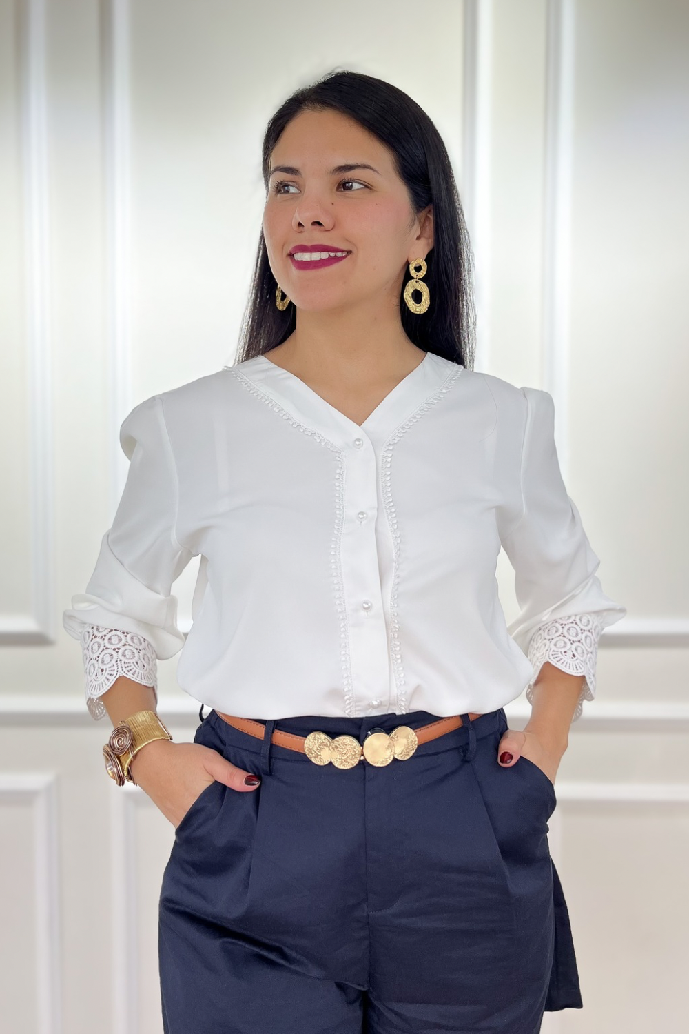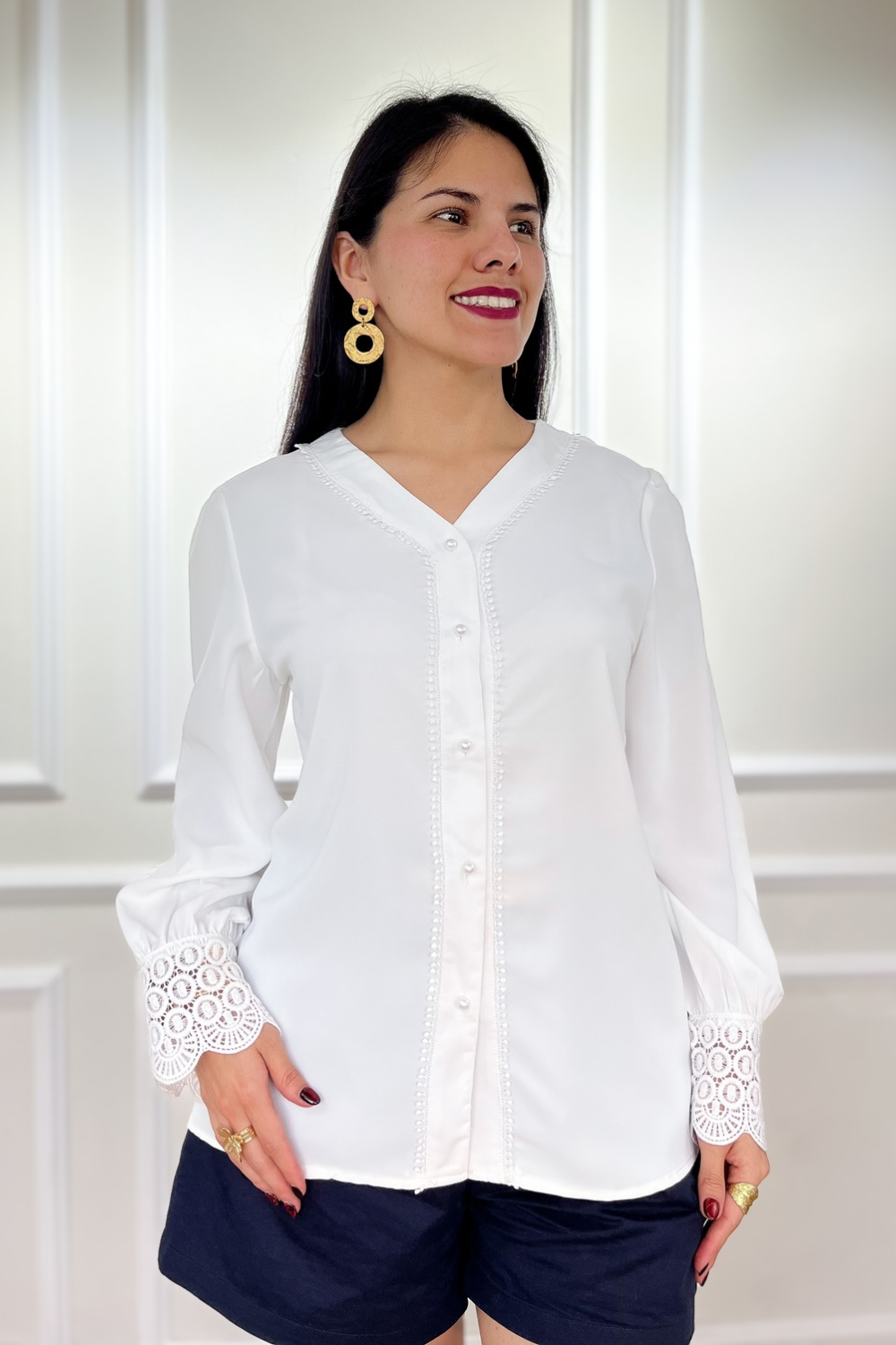 Blusa en tejido gasa, escote V y manga larga con terminación de encaje y botones en puño. Botones delanteros funcionales y detalle de encaje en borde de escote y botonadura. Corte recto. Fit regular.
