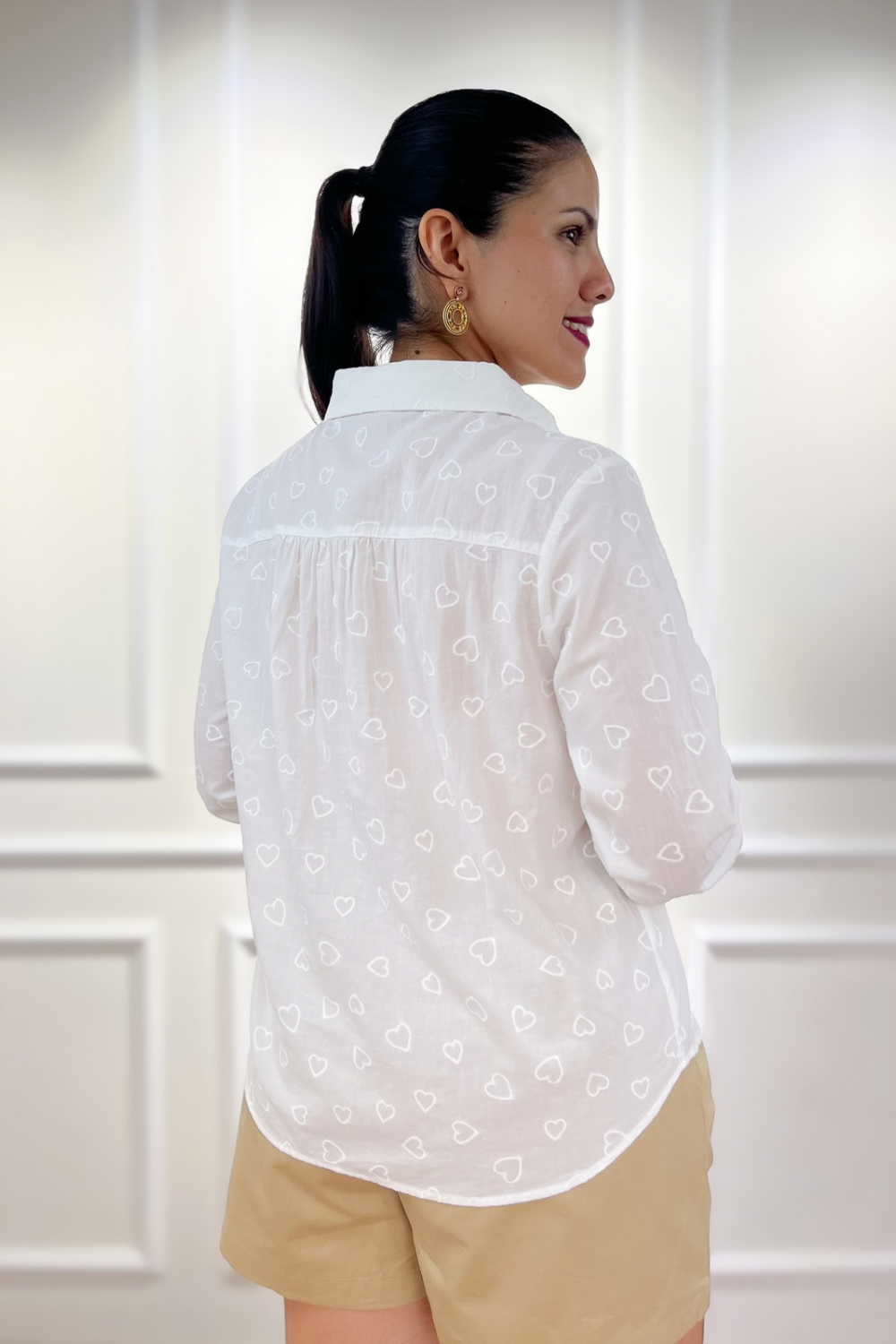 Camisa en tejido de algodón con detalle de corazones bordados, cuello con solapa y manga larga con botón en puño. Botones delanteros funcionales invisibles. Corte recto con bajo ligeramente redondeado. Fit regular