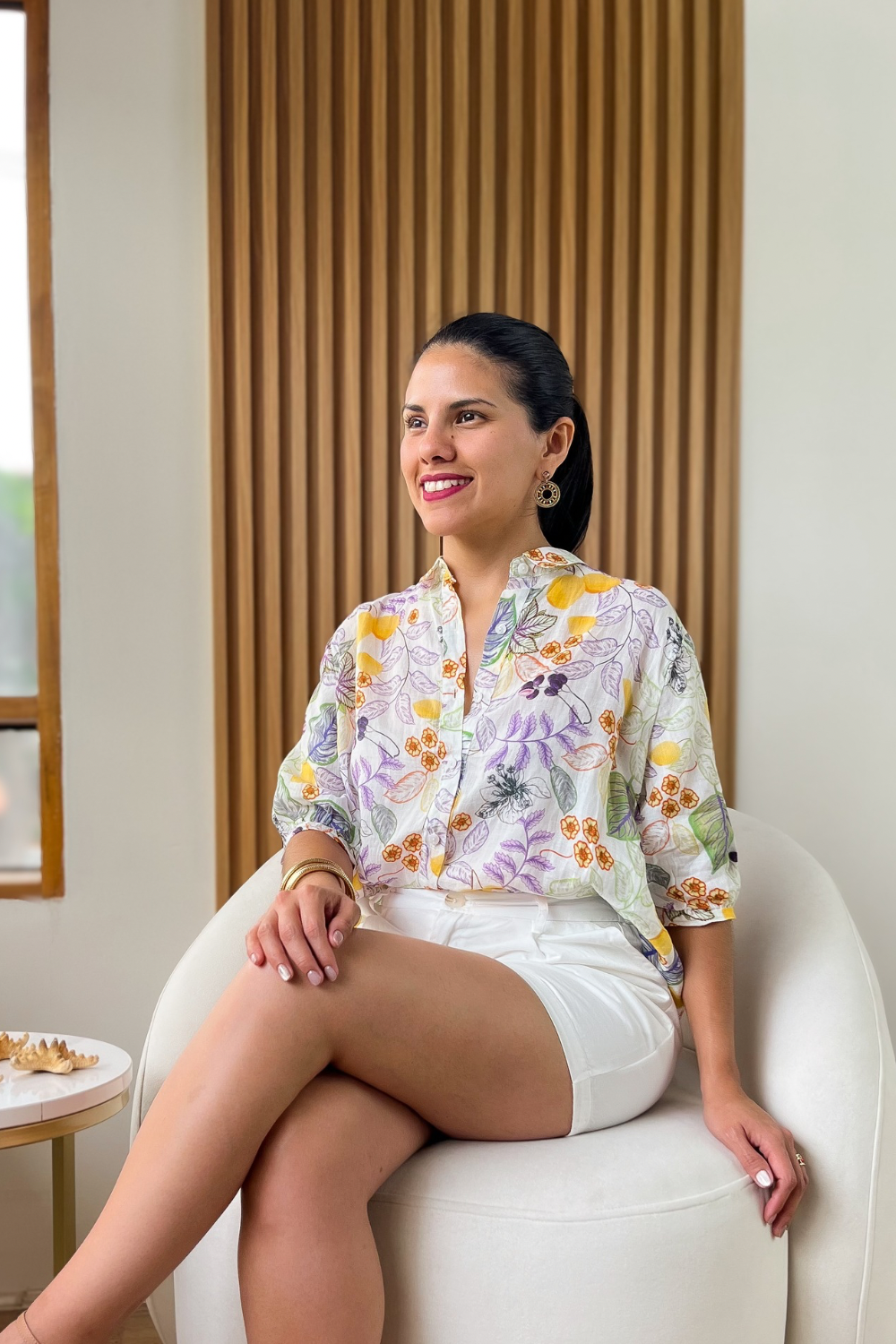 Camisa en tejido ramio estampado, cuello con solapa y manga corta con botón en pretina. Botones delanteros funcionales. Diseño de corte recto con bajo ligeramente redondeado. Fit oversize