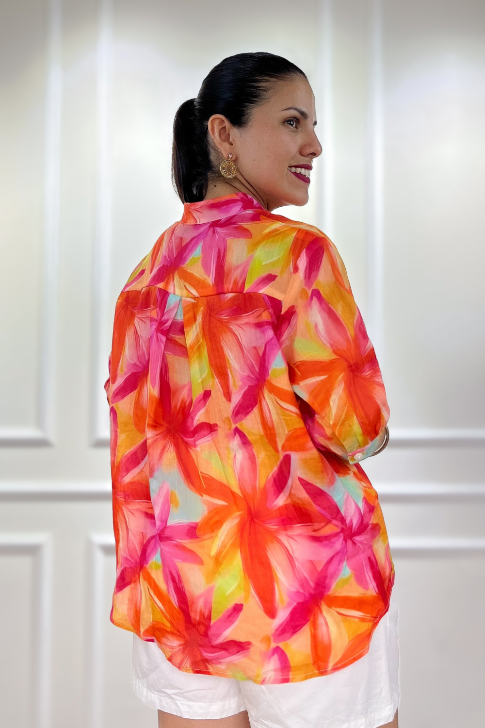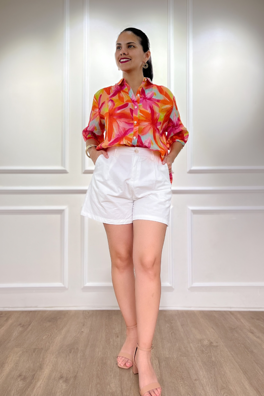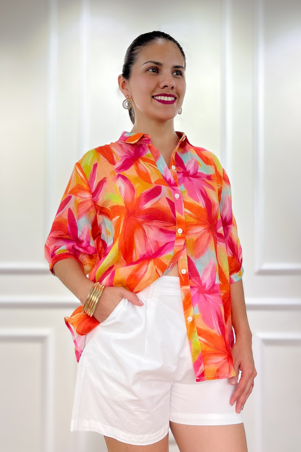 Camisa en tejido ramio estampado, cuello con solapa y manga corta con botón en pretina. Botones delanteros funcionales. Diseño de corte recto con bajo ligeramente redondeado. Fit oversize