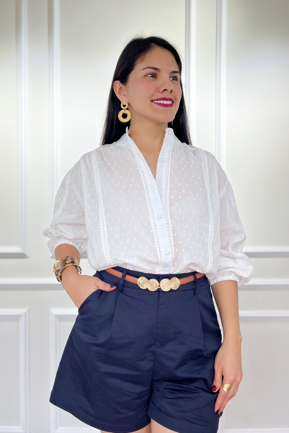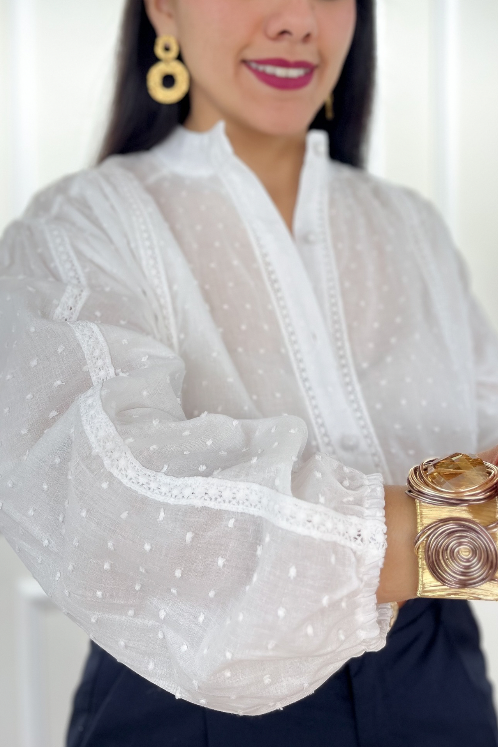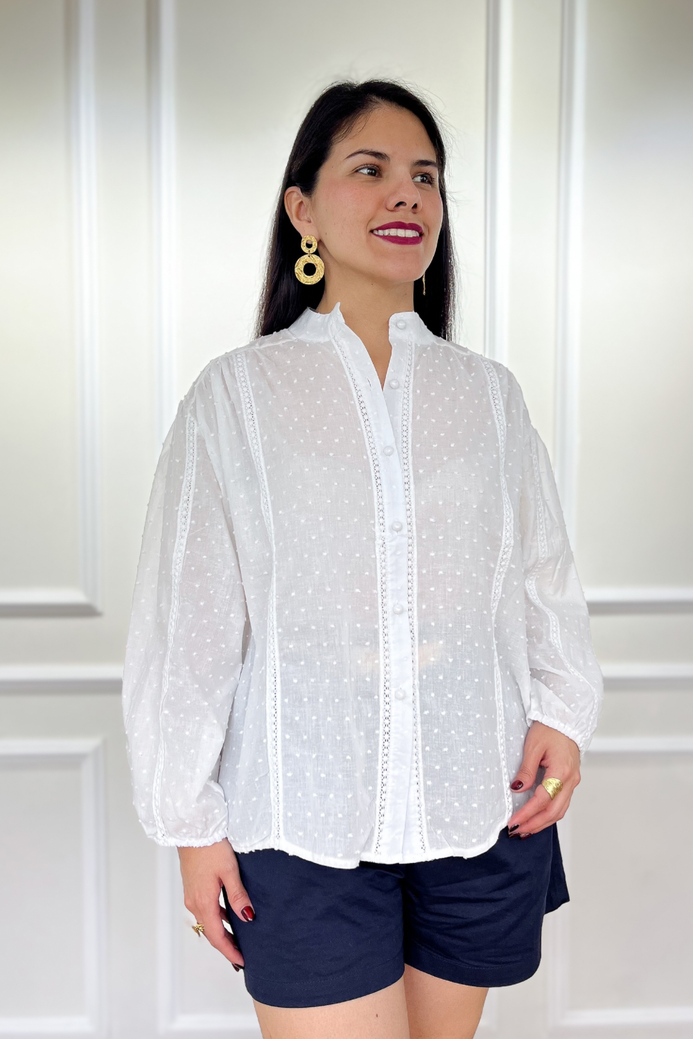 Blusa oversize en tejido de algodón, escote redondo, hombros caídos y manga larga abullonado con elástico en puño. Botones forrados delanteros funcionales. Corte en A y bajo ligeramente redondeado. Fit oversize.
