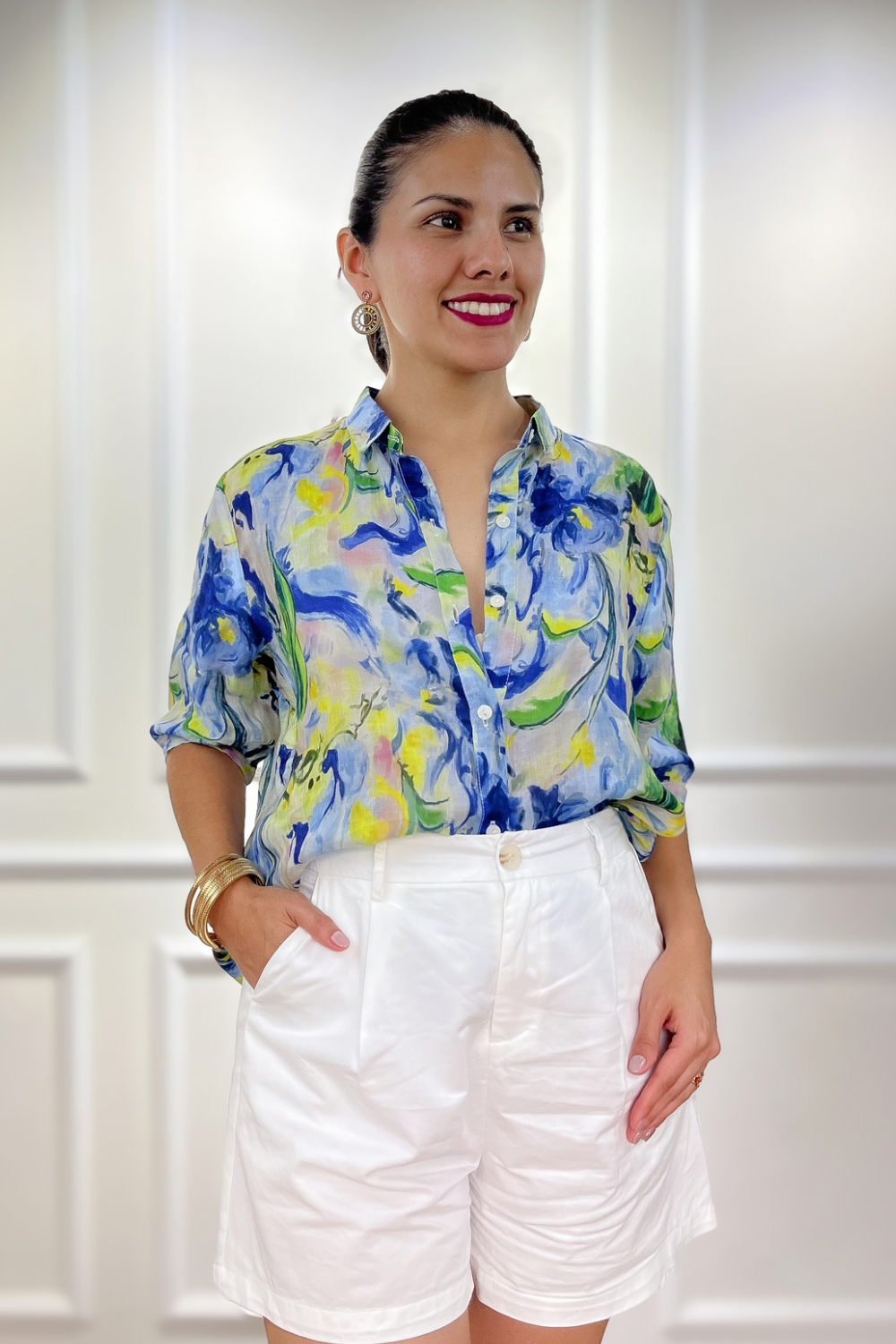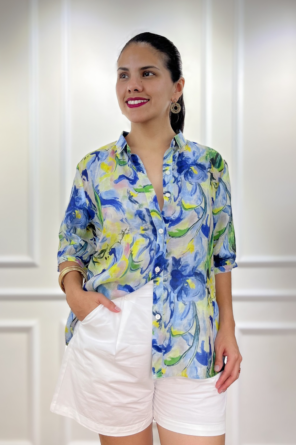 Camisa en tejido ramio estampado, cuello con solapa y manga corta con botón en pretina. Botones delanteros funcionales. Diseño de corte recto con bajo ligeramente redondeado. Fit oversize