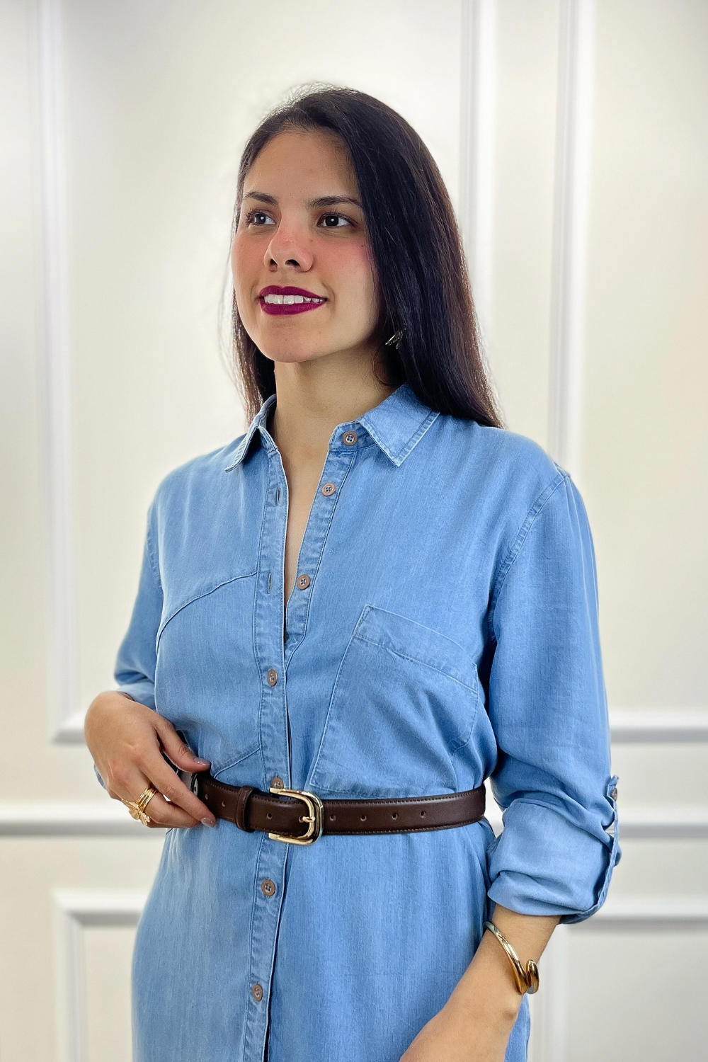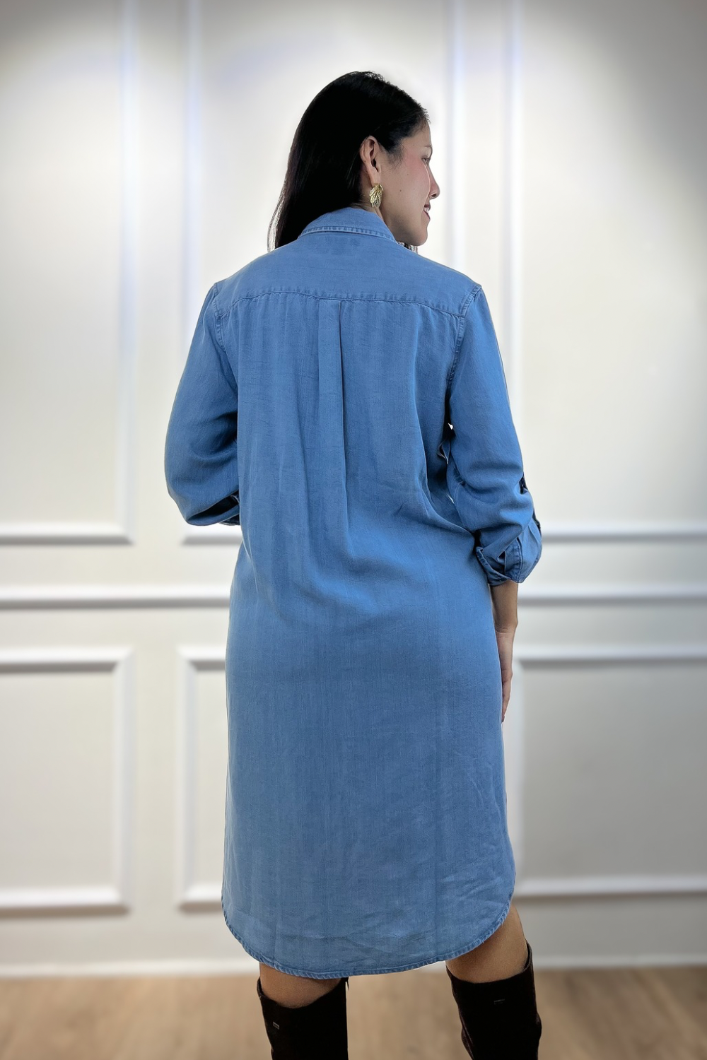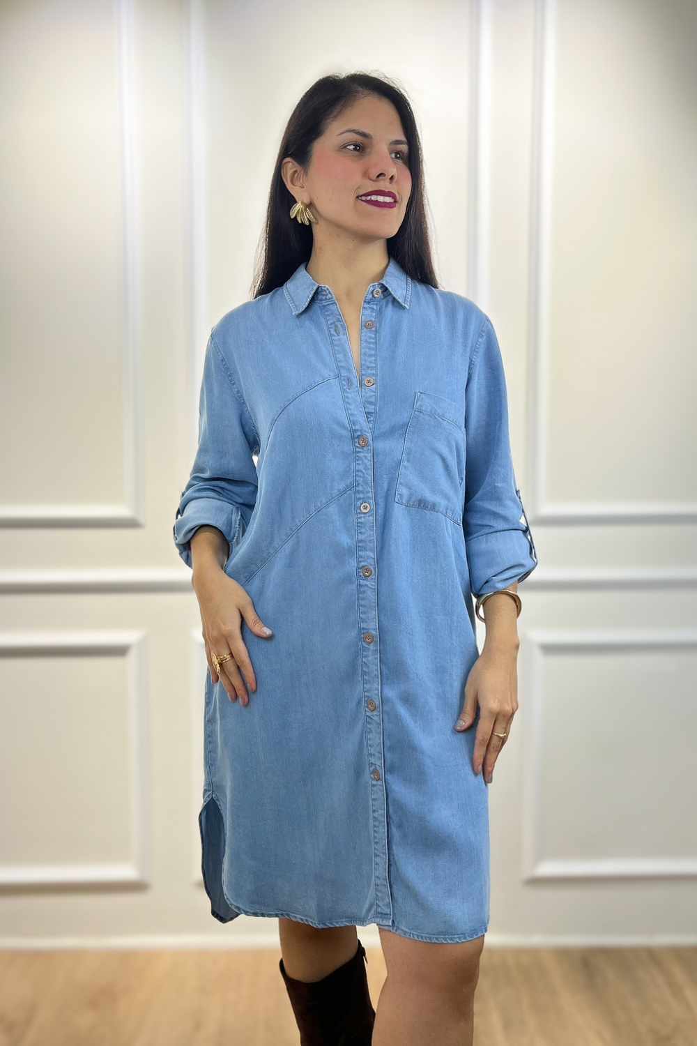 Vestido en tejido tencel, cuello camisero y botones delanteros funcionales. Manga larga, cuenta con un botón en medio de la manga para la conversión a 3/4. Detalle de bolsillo de parche en pecho. Corte recto con bajo redondeado. La parte trasera es ligeramente más corta que la delantera. Fit holgado.