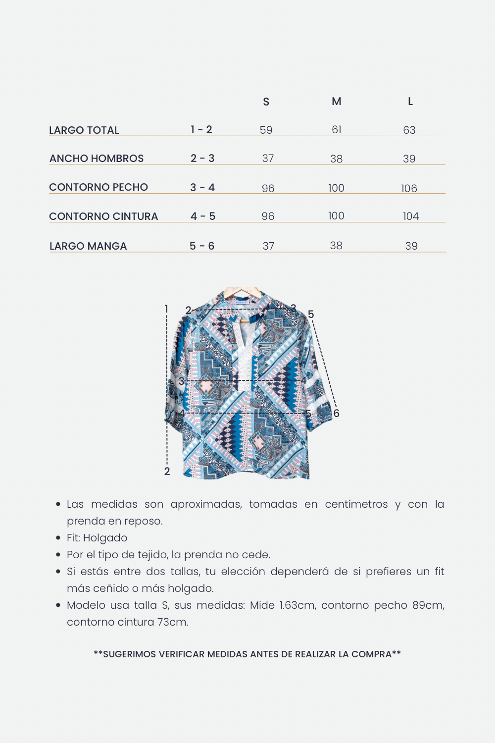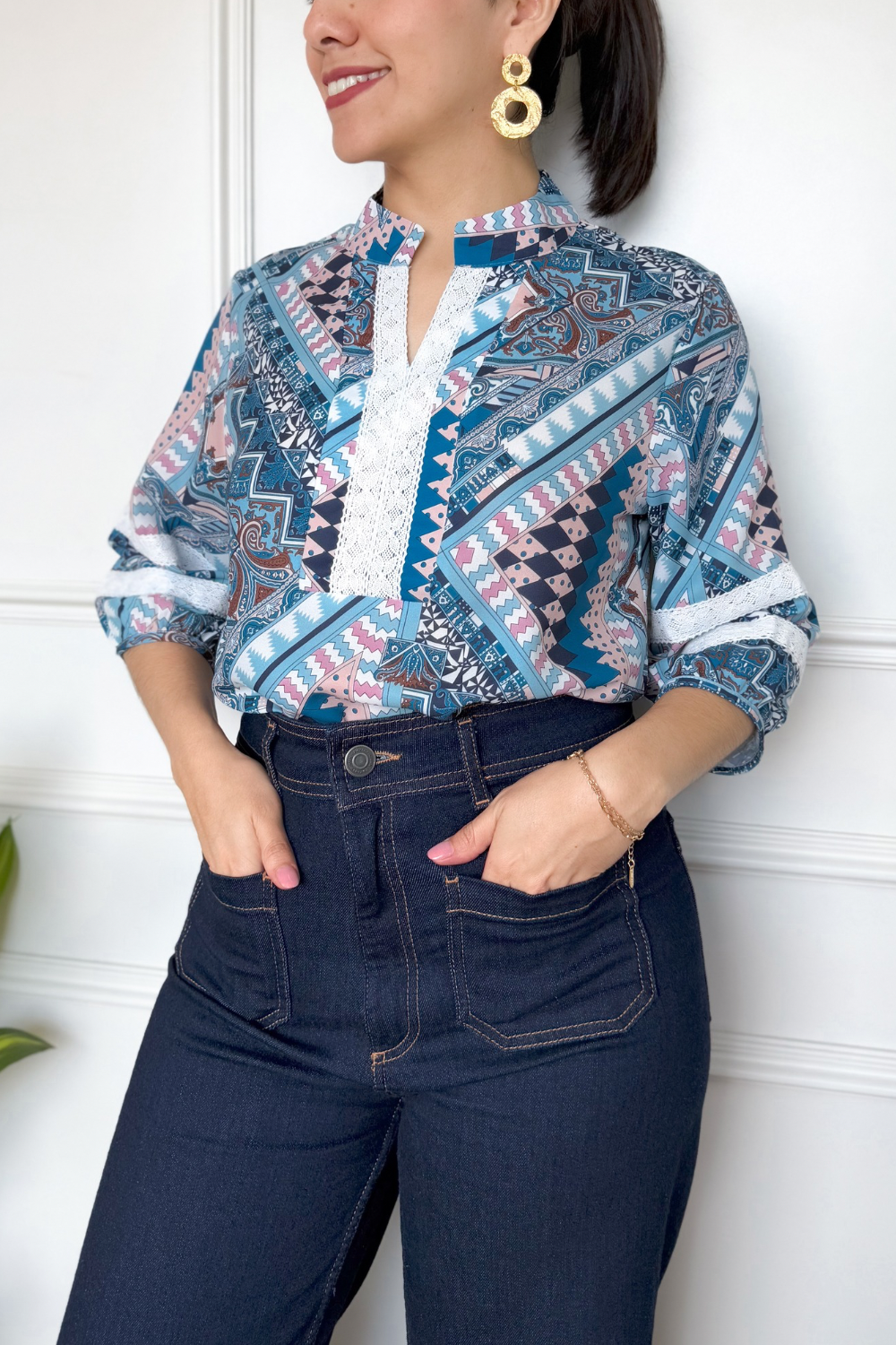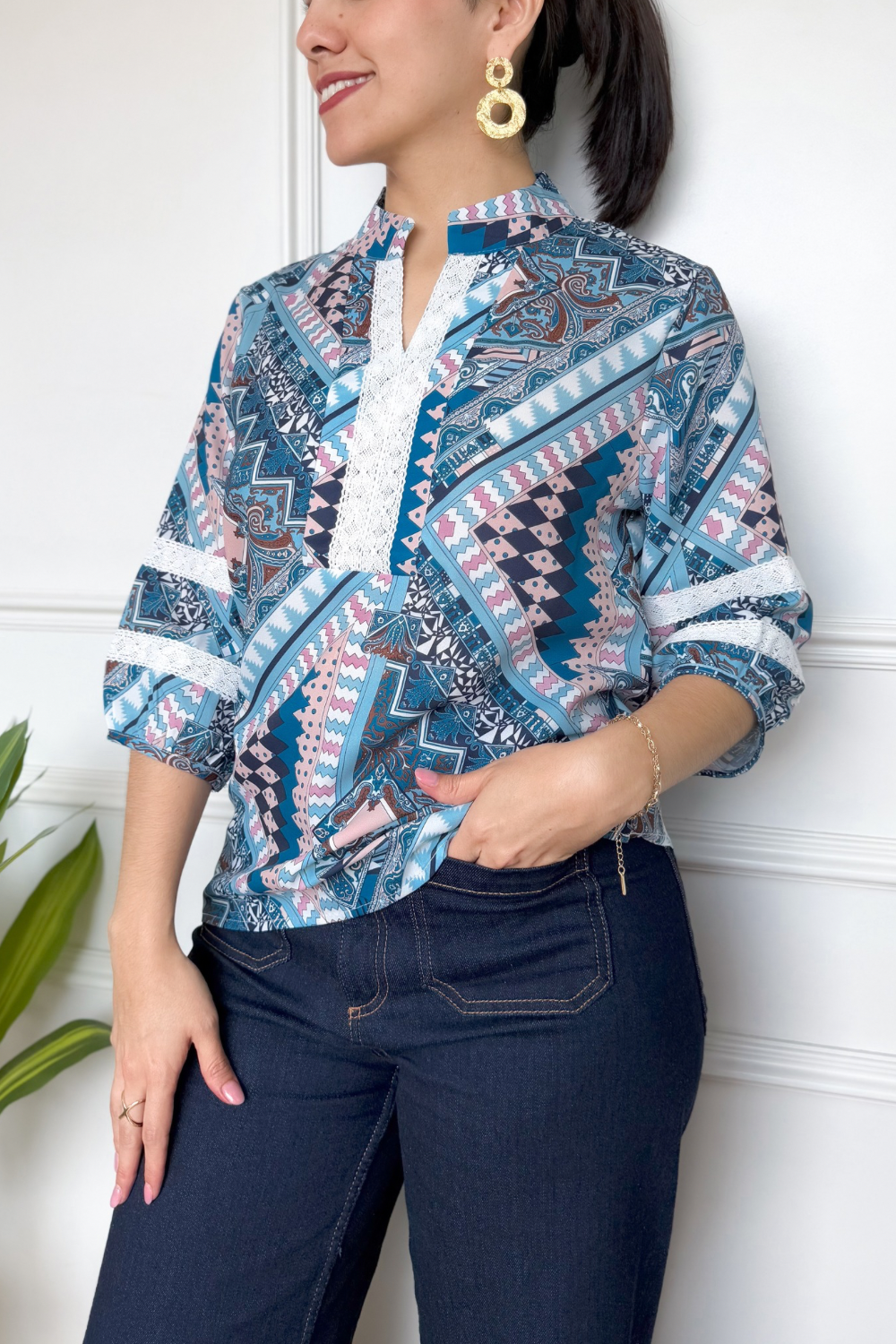 Camisa en tejido de gasa crepé estampado, cuello mao con ligero escote en pico. Detalle de delicado tejido crochet en pecho y brazos. Manga ¾ ligeramente abullonado. Diseño de corte recto en laterales y bajo. Fit regular