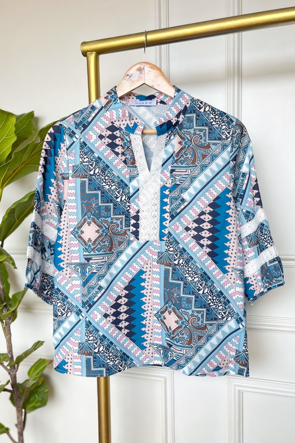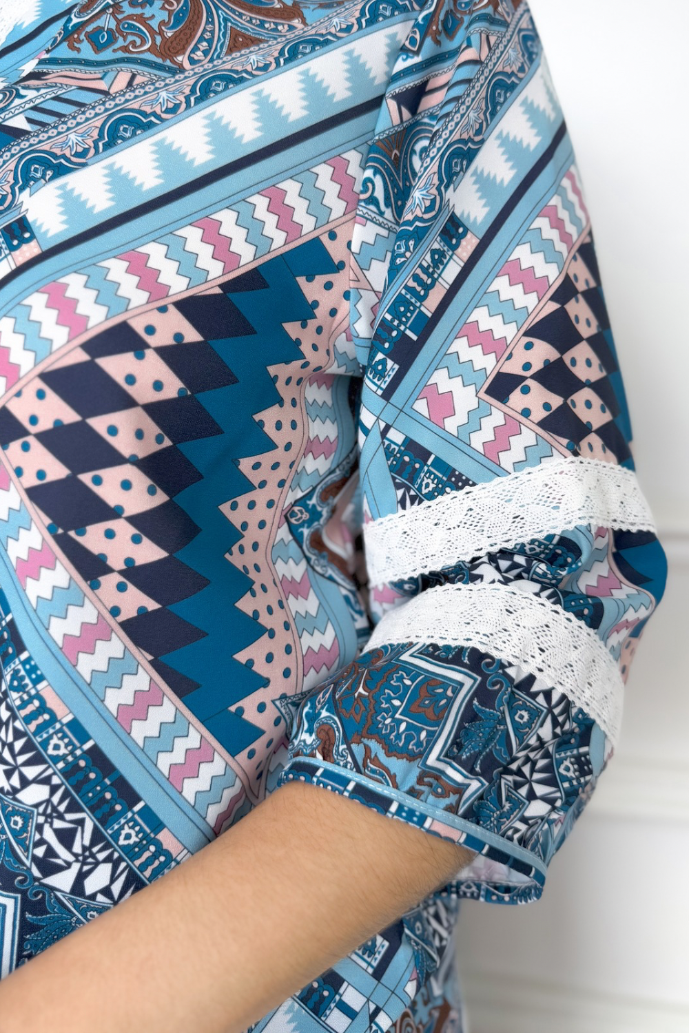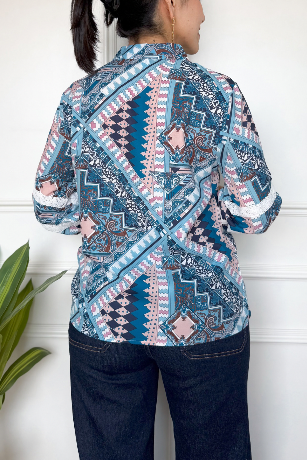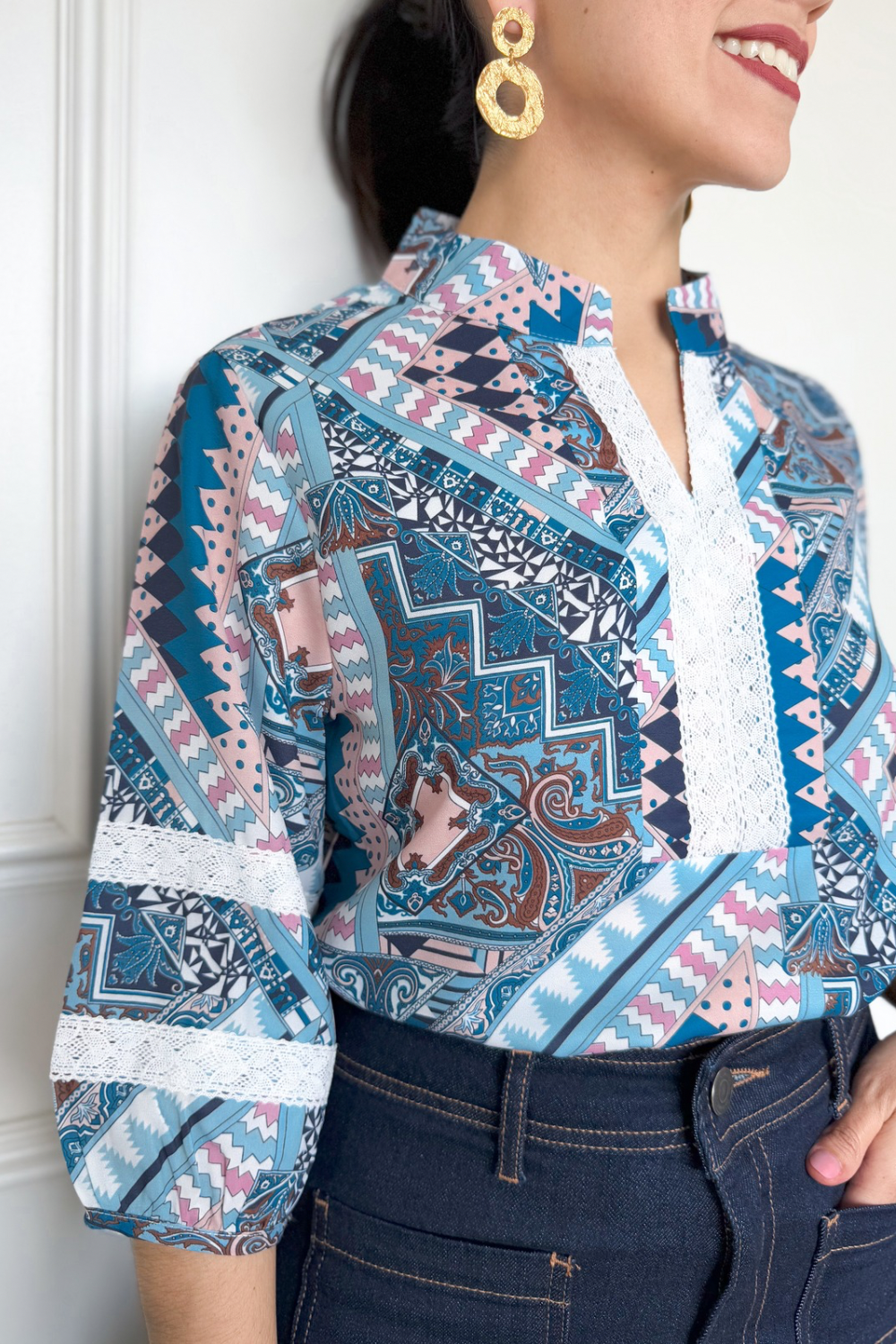 Camisa en tejido de gasa crepé estampado, cuello mao con ligero escote en pico. Detalle de delicado tejido crochet en pecho y brazos. Manga ¾ ligeramente abullonado. Diseño de corte recto en laterales y bajo. Fit regular
