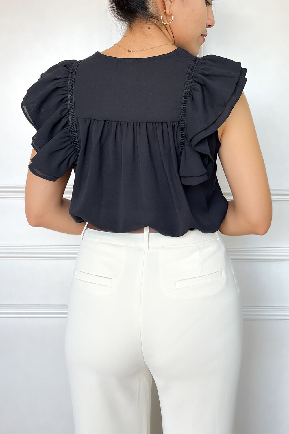 Blusa de escote en V, mangas con volados estilo mariposa y botones forrados de cierre en la parte delantera. Fit suelto.