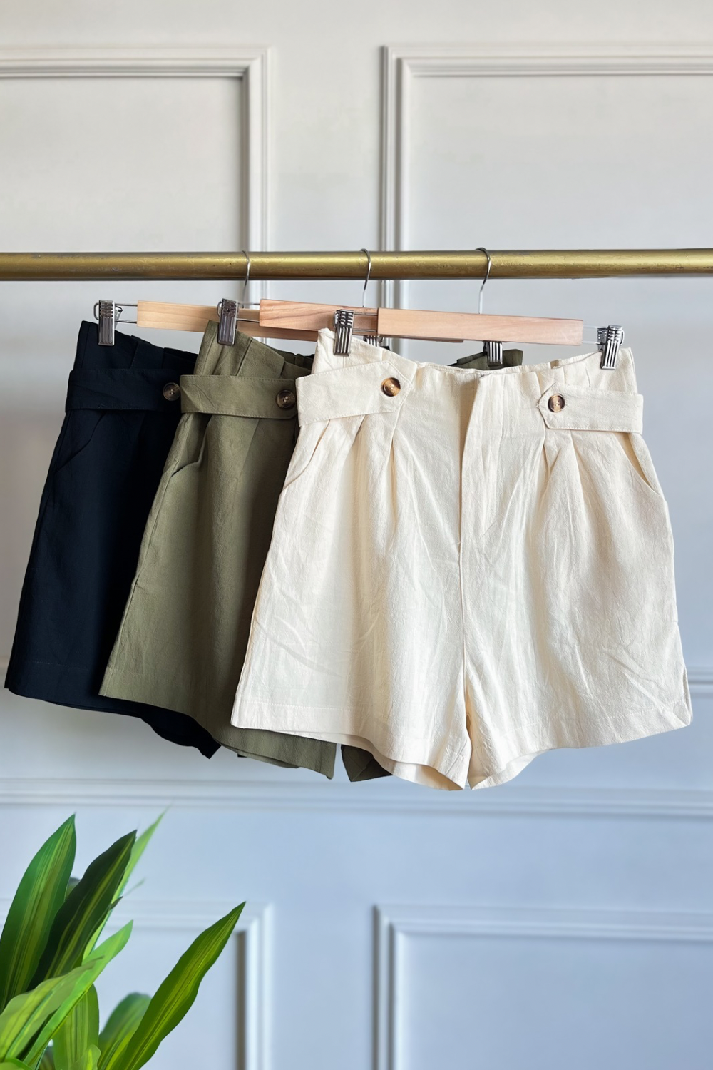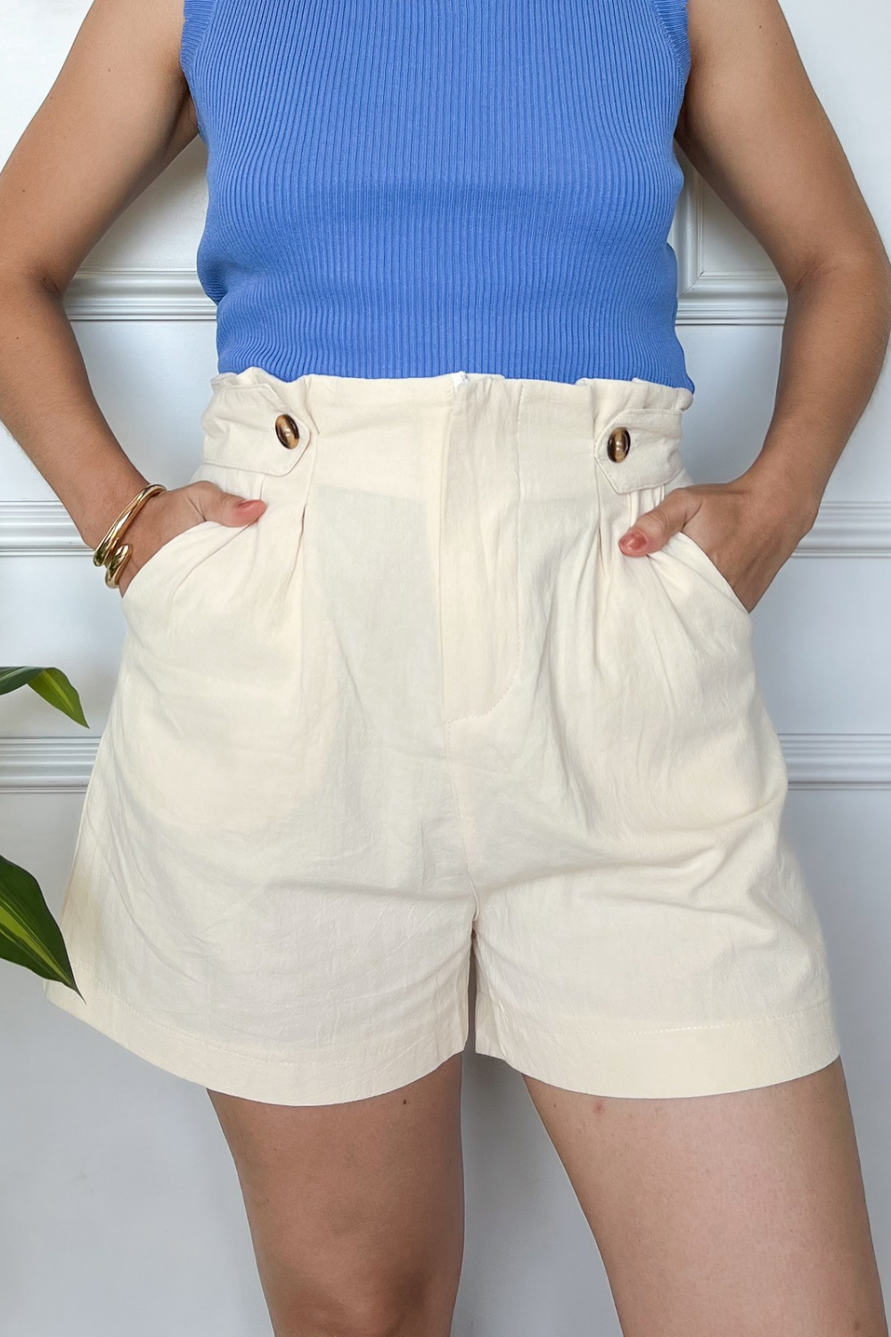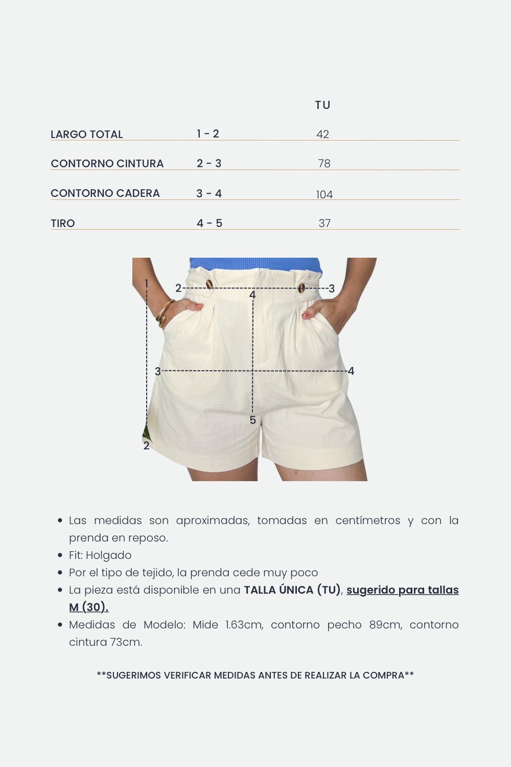 Short en tejido de lino y viscosa, modelo de corte holgado, tiro alto con pinzas delanteras y traseras, pliegues en cintura. Bolsillos laterales funcionales con cierre de cremallera por delante.