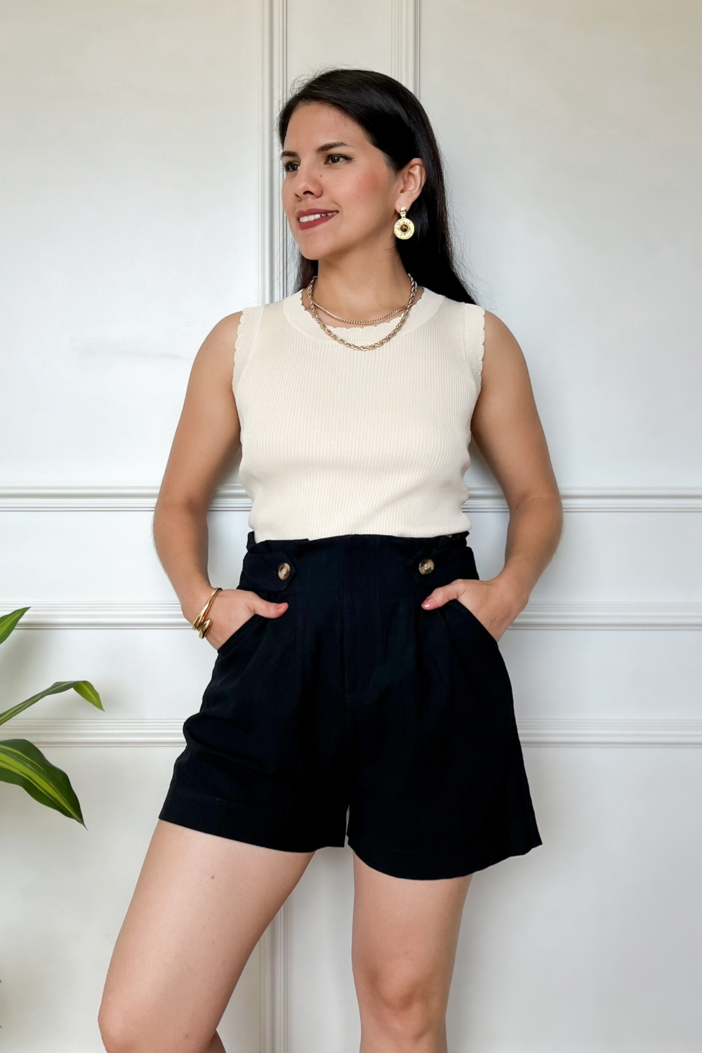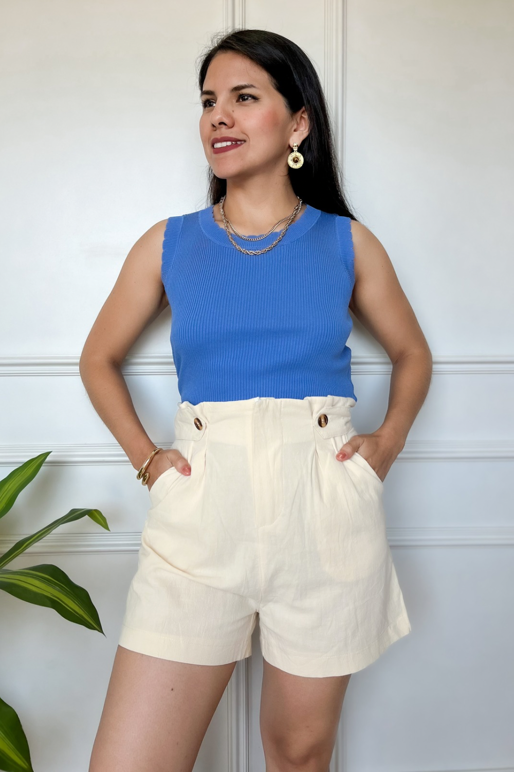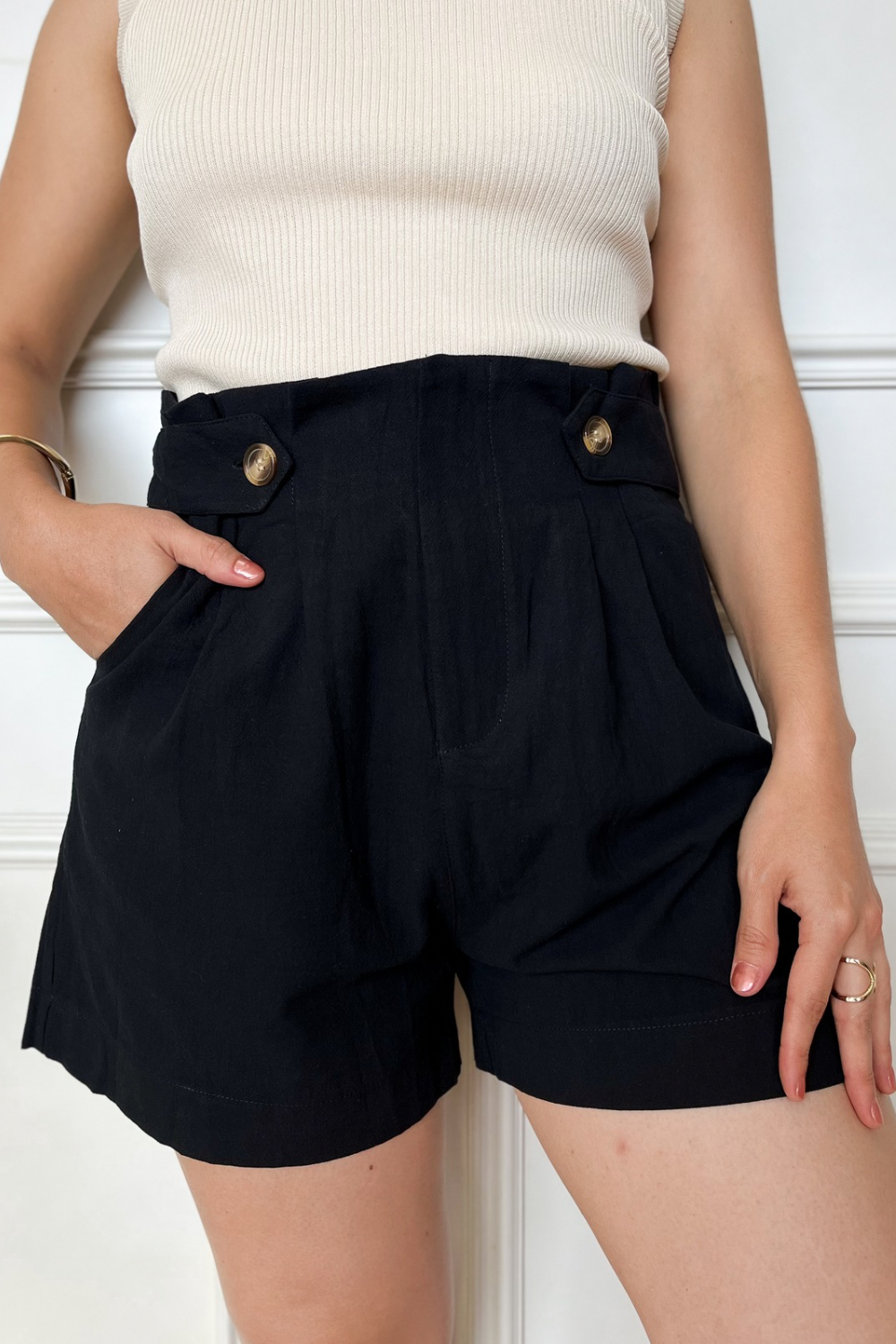 Short en tejido de lino y viscosa, modelo de corte holgado, tiro alto con pinzas delanteras y traseras, pliegues en cintura. Bolsillos laterales funcionales con cierre de cremallera por delante.