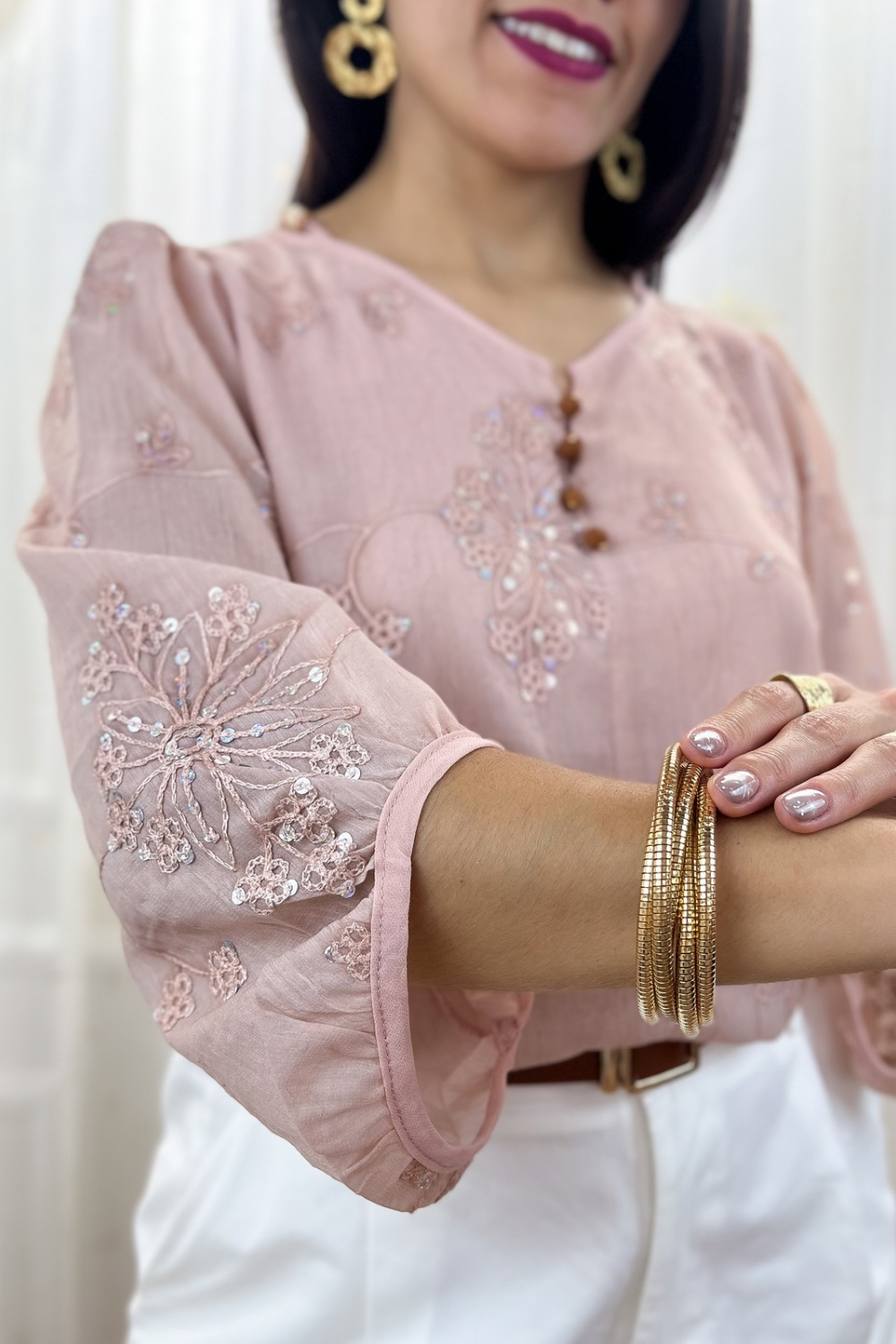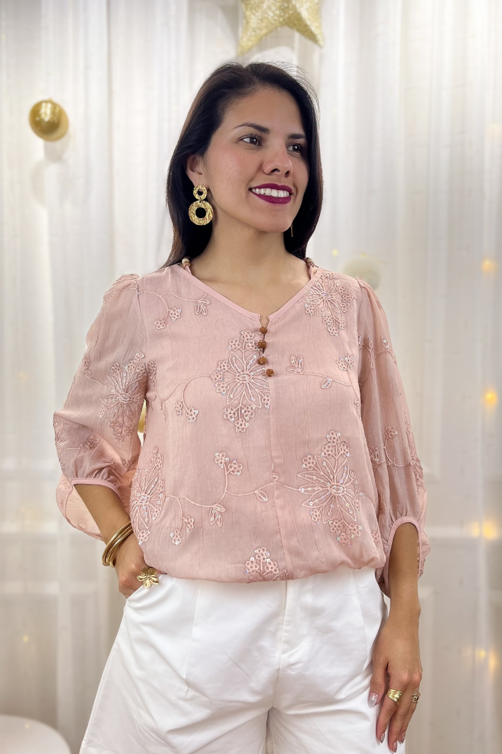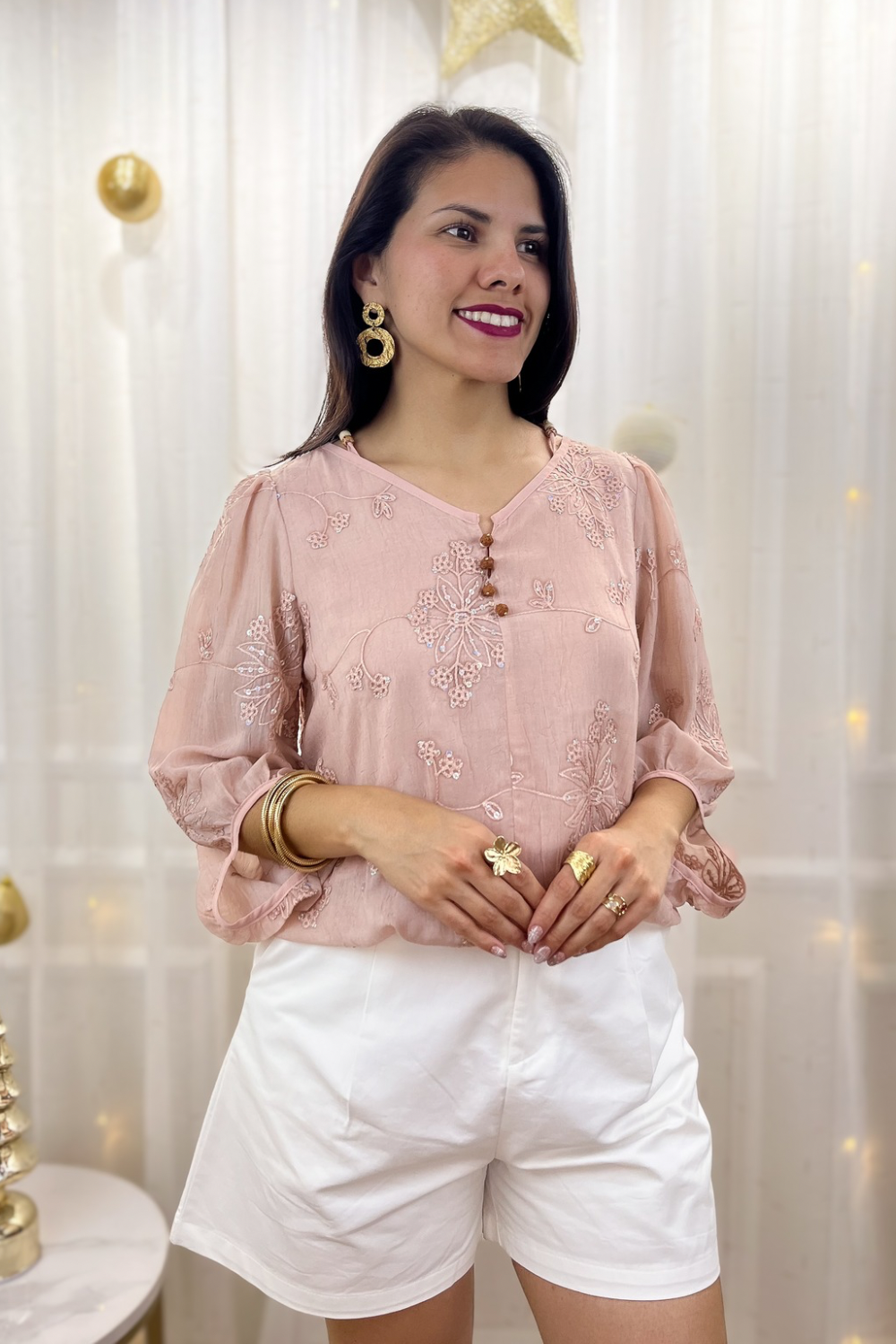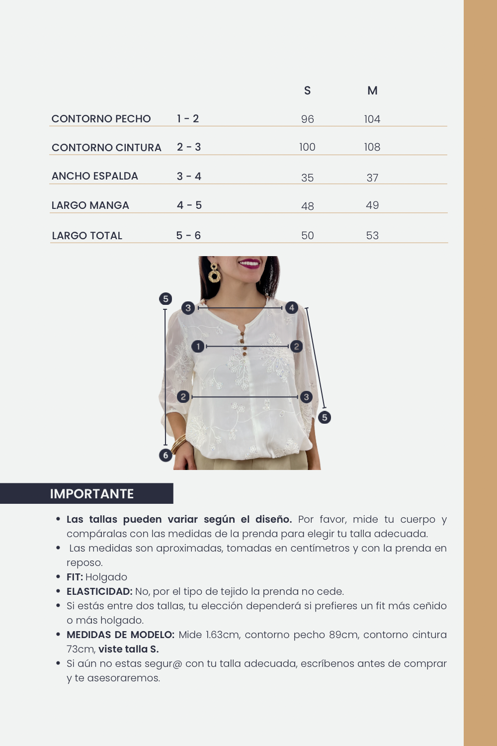 Blusa en tejido de gasa bordada, escote V y manga abullonada ¾. Detalle de aplique en hombros y botones en tono chocolate en pecho. Corte recto y bajo con efecto abullonado. Forro interno. Fit holgado.
