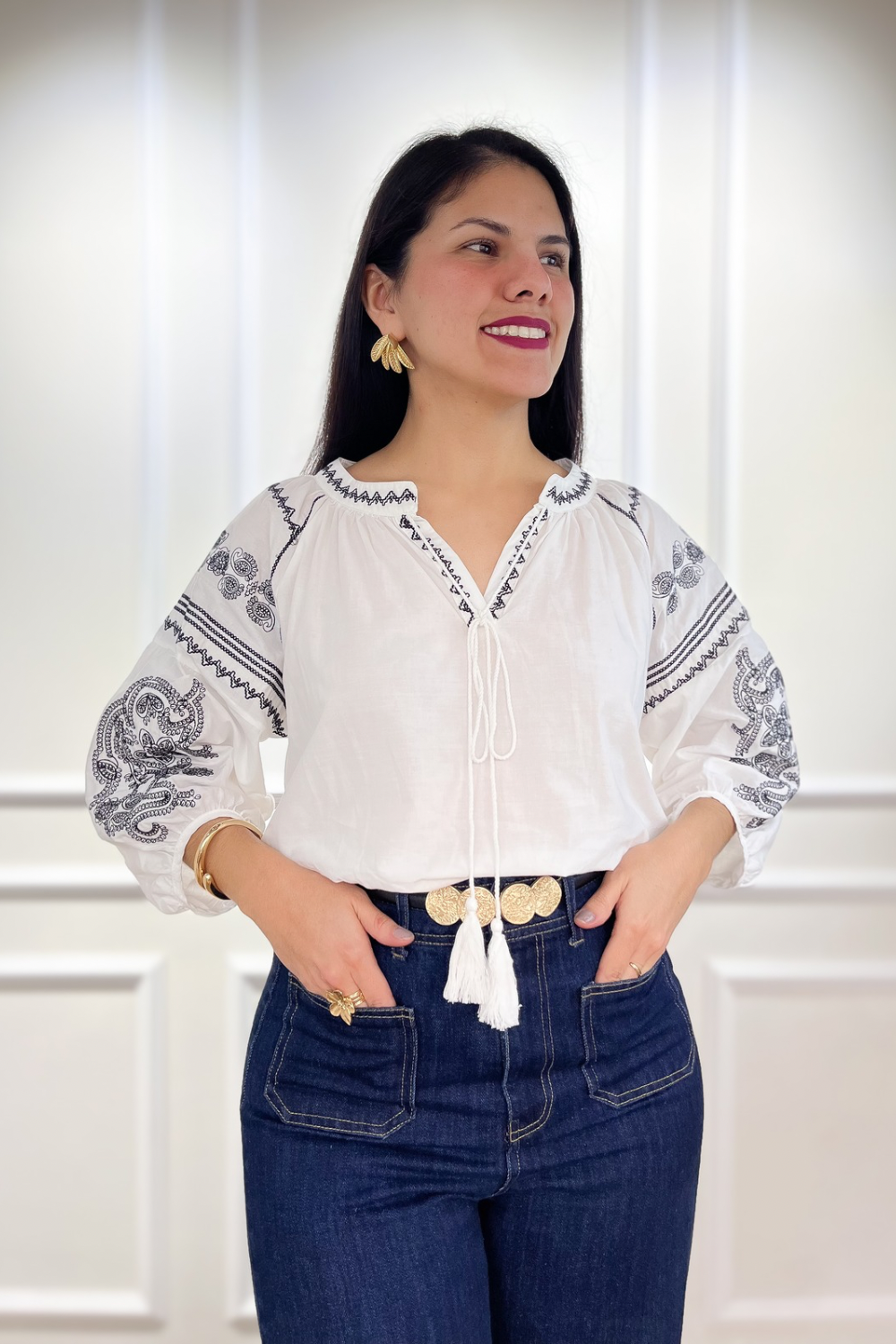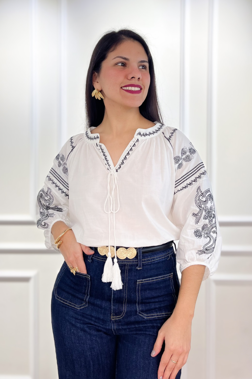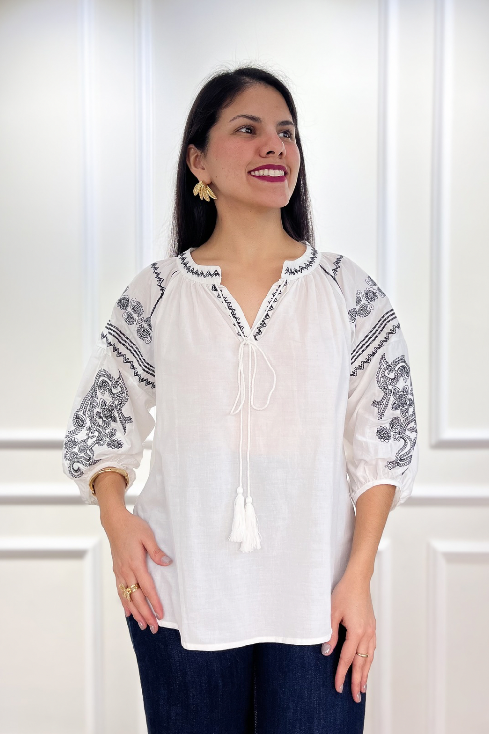 Blusa en tejido algodón, cuello redondo con cordón con borlas y escote en V. Manga abullonada ¾ y detalle de bordados combinados a contraste. Corte A. Fit holgado.