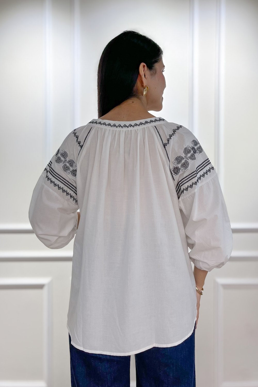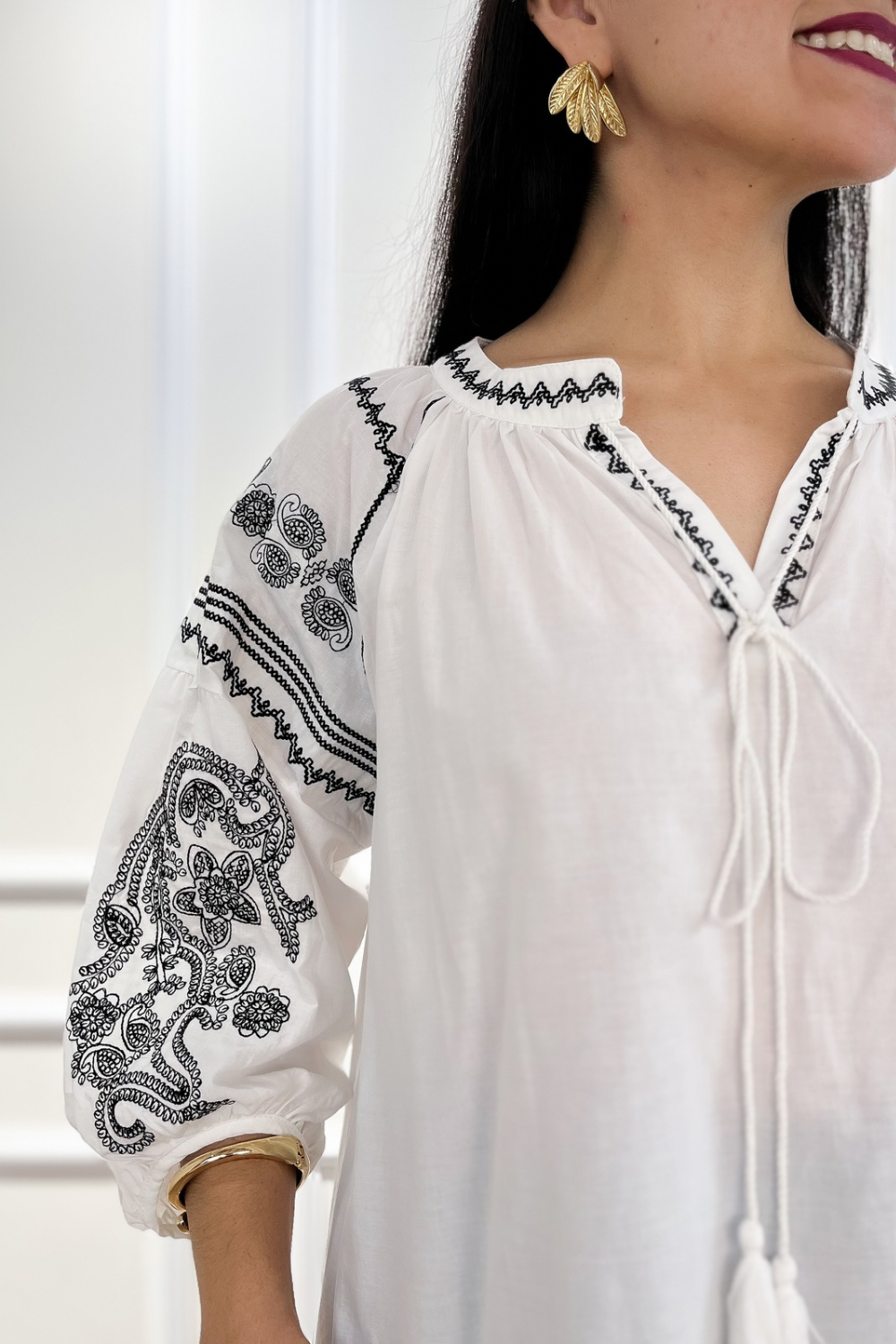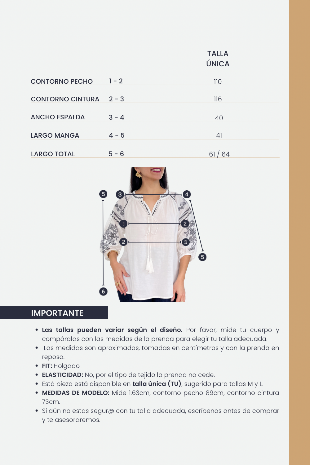 Blusa en tejido algodón, cuello redondo con cordón con borlas y escote en V. Manga abullonada ¾ y detalle de bordados combinados a contraste. Corte A. Fit holgado.