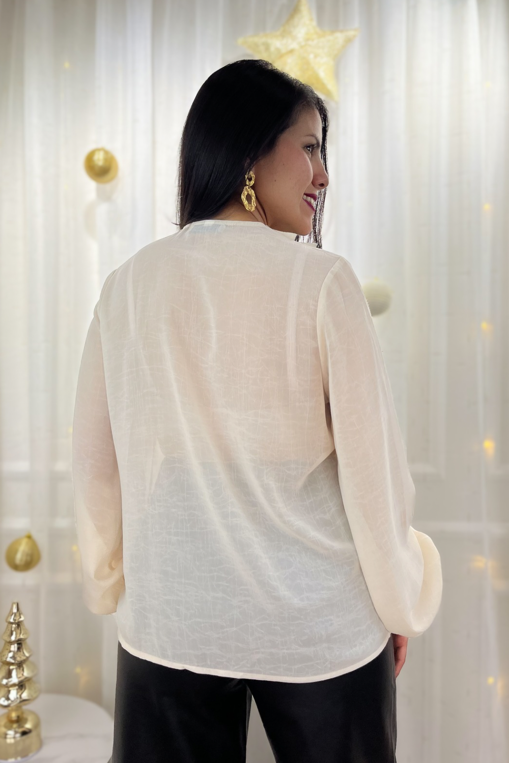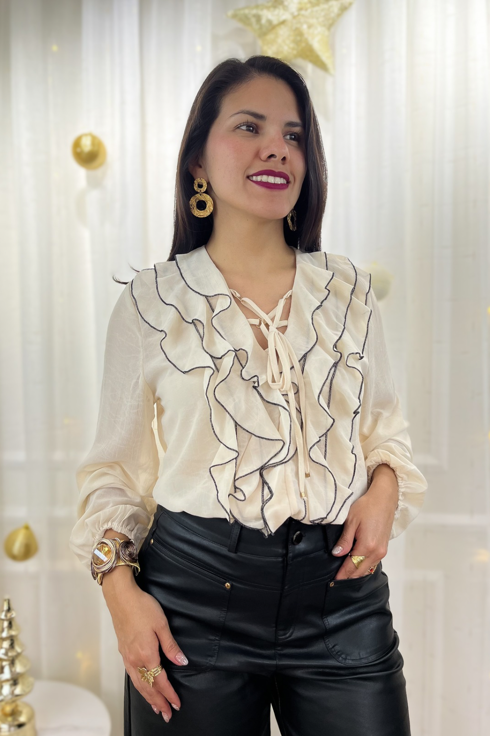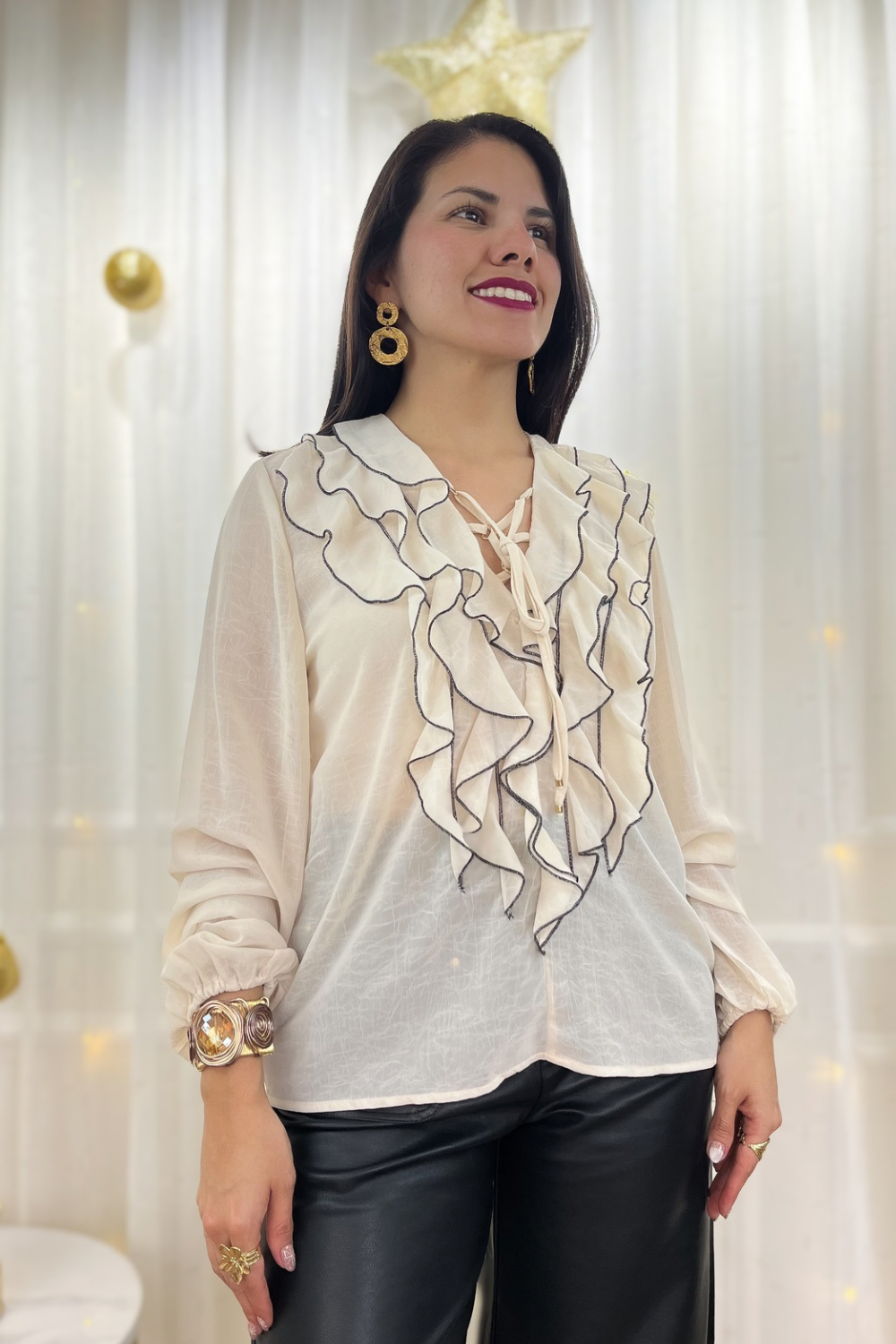 Blusa en tejido de gasa, escote V y manga larga ligeramente abullonado con terminación de elástico en puño. Detalle de volados en pecho con costura final a contraste y cierre con lazo. Corte recto. Fit holgado.