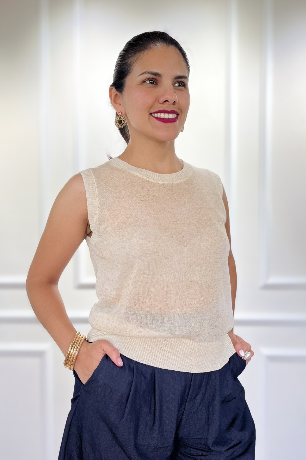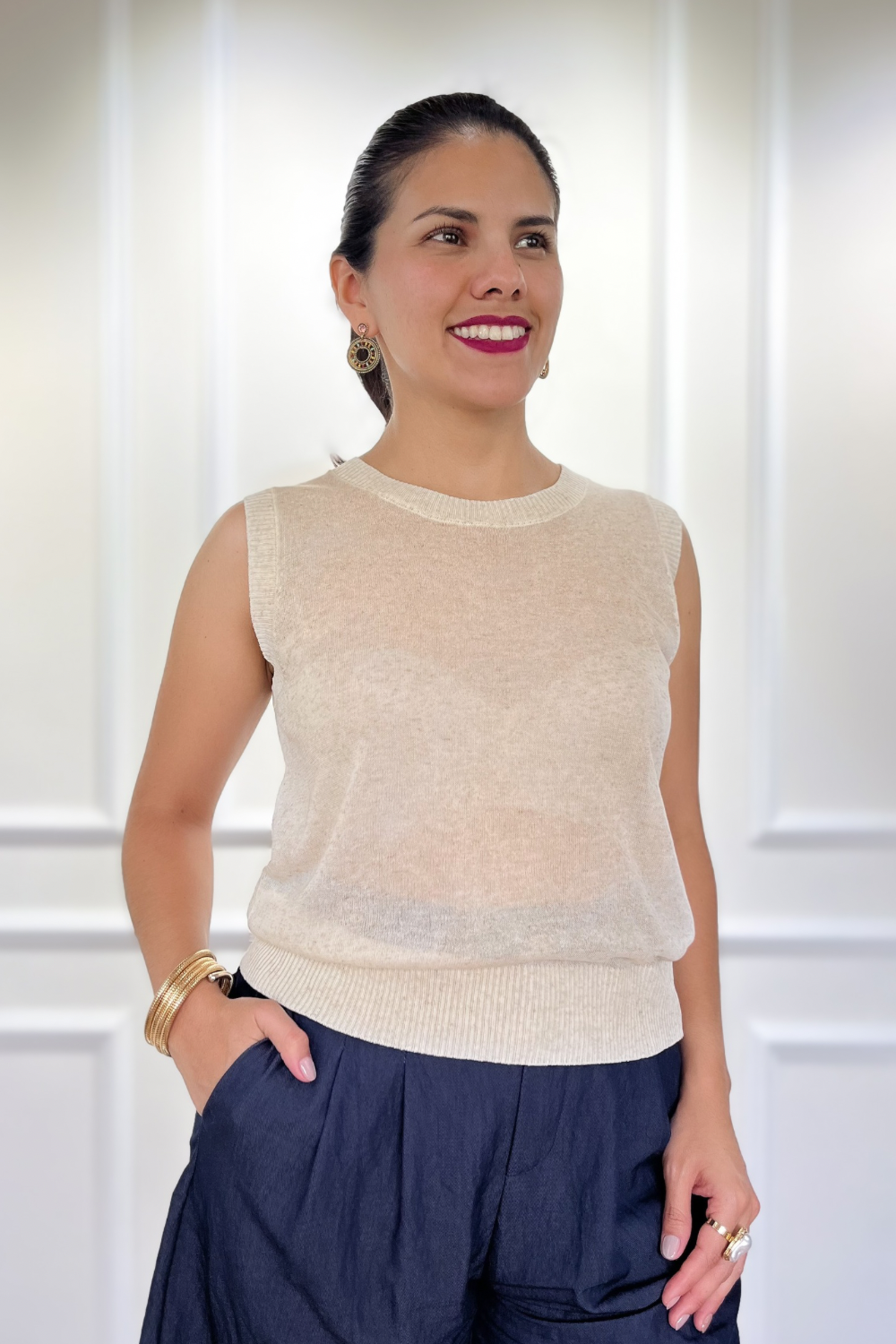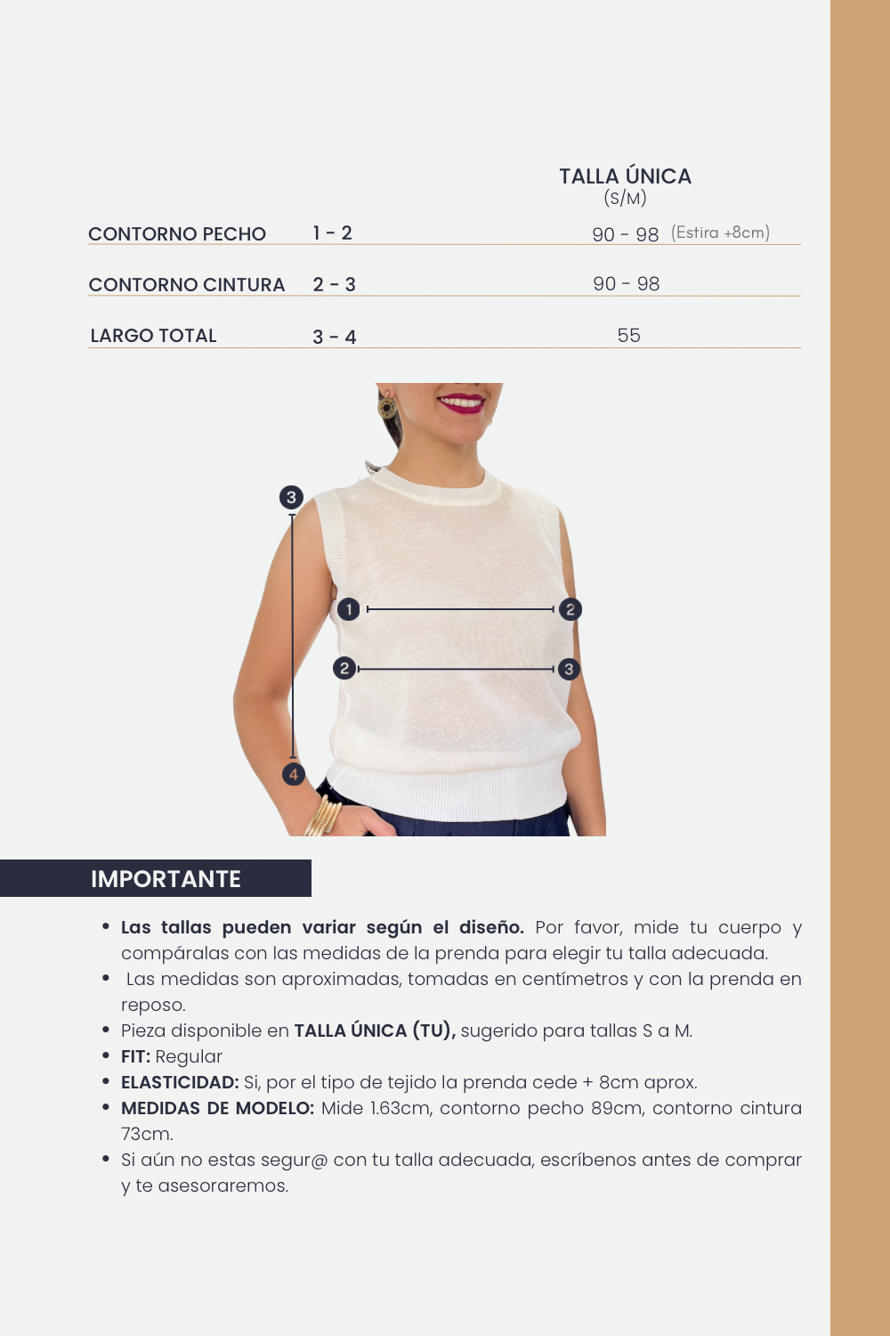 Básico tejido en punto, escote redondo con ribetes acanalados. Diseño recto en bajo y laterales. Fit regular.