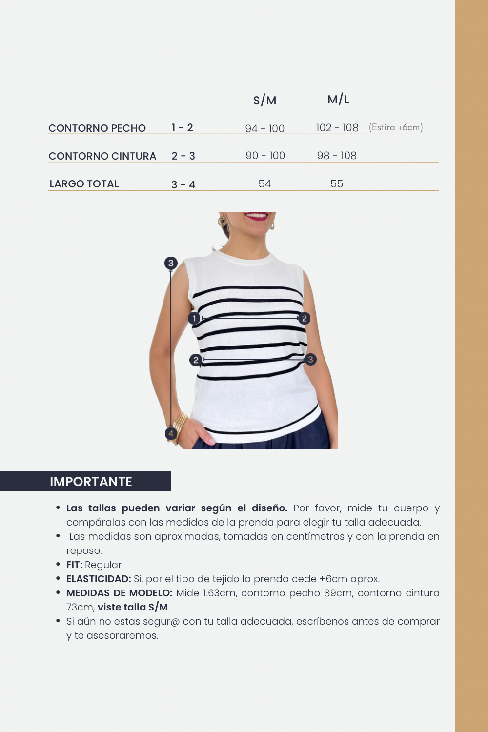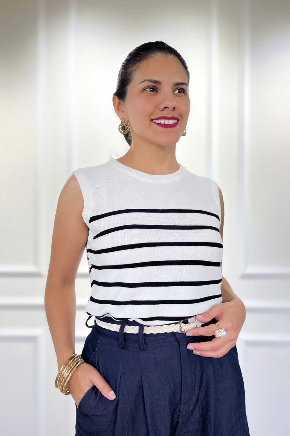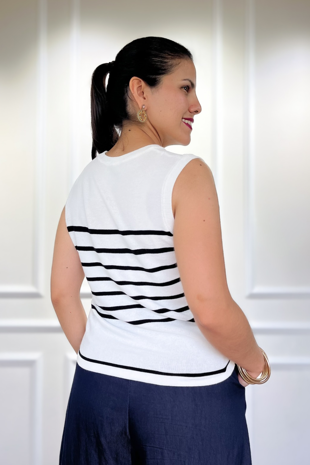 Básico tejido en punto suave, escote redondo con ribetes acanalados. Patrón de rayas negras.