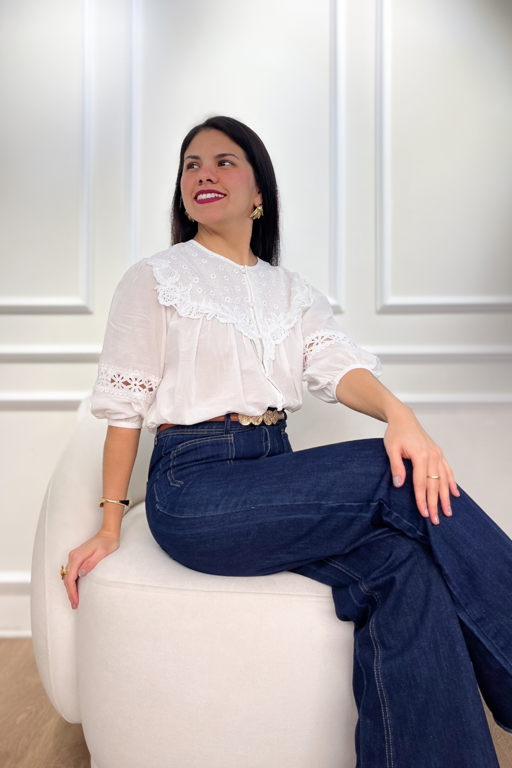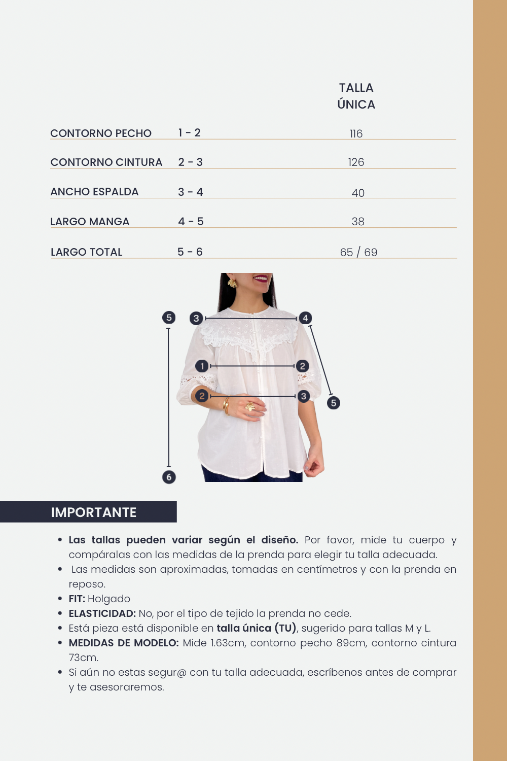 Blusa de cuello redondo y manga abullonada 3/4. Botones delanteros funcionales y detalles de bordados en pecho y espalda. Corte A y bajo redondeado. Fit holgado.