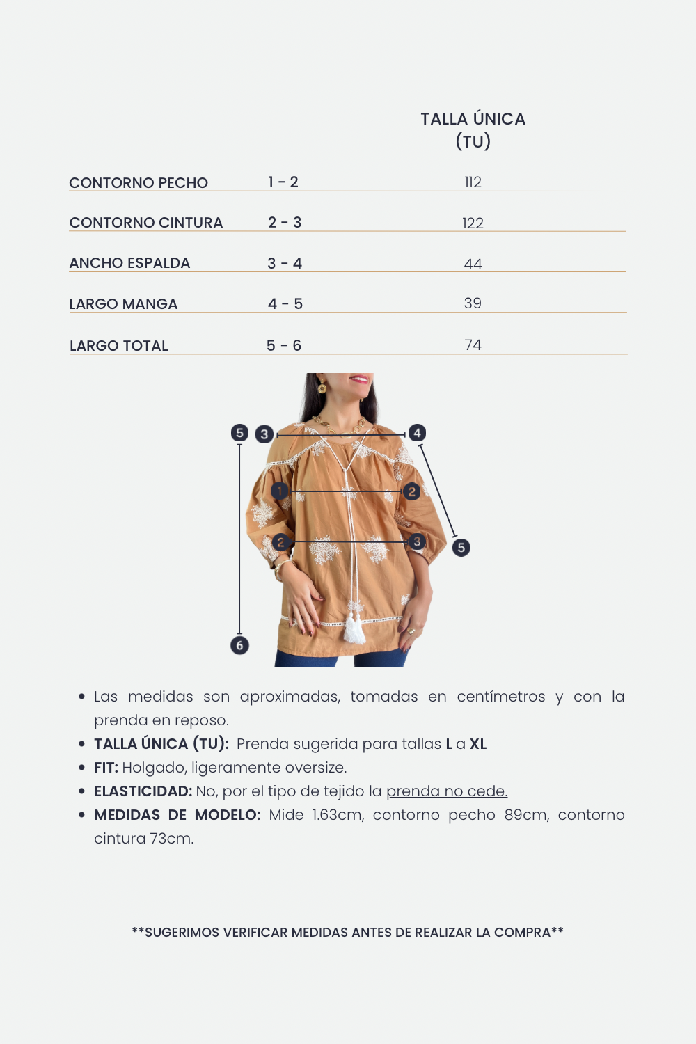 Blusa en tejido algodón, escote ligero en V con detalle de cuerdas y manga 3/4 abullonado. Detalle de bordado en tono beige con troquel bordado en hombros, espalda y bajo. Corte en A. Fit oversize.